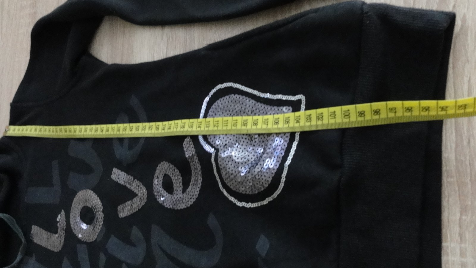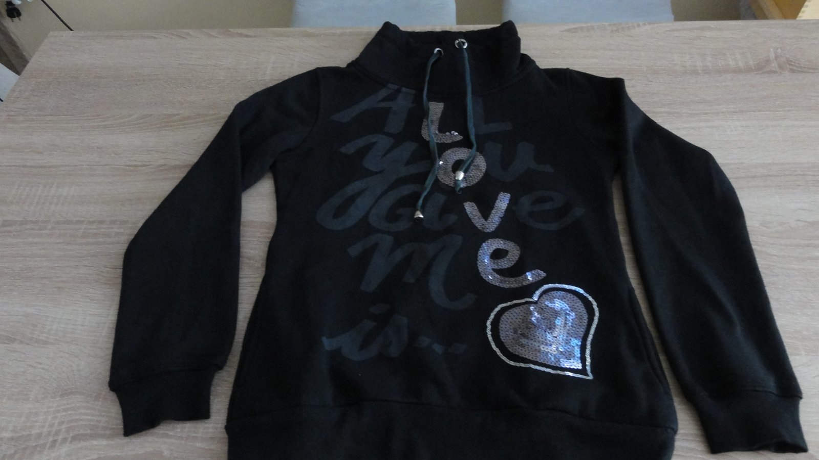 Černá mikina přes hlavu, velikost 146, délka 57 cm, délka rukávu 57 cm, míra přes prsa 2 x 44 cm.