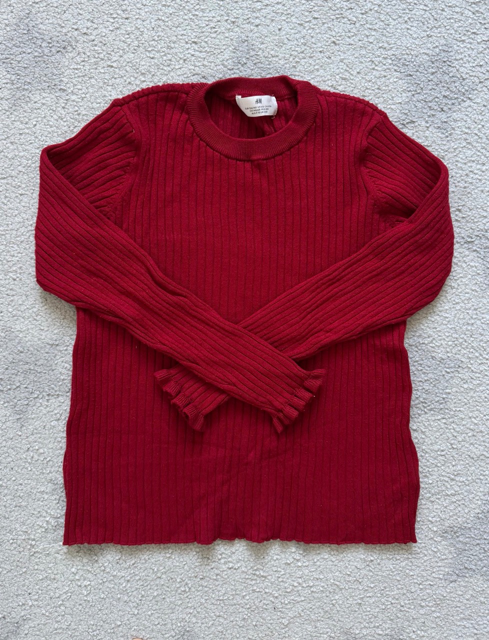 Dívčí svetřík H&M 134/140 (8-10 let) červený úplet protkaný stříbrnou nitkou, u krku látková mašlička. Top stav jen po dceři, oblečený max 2x.