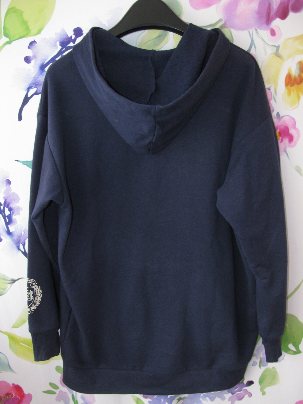 Skvělá bavlněná tmavě modrá mikina s kapucí, zap. na zip, přední kapsa, pružné lemy, nápis neporušený, 71% bavlna, 29% polyester. Krásný stav bez vady.