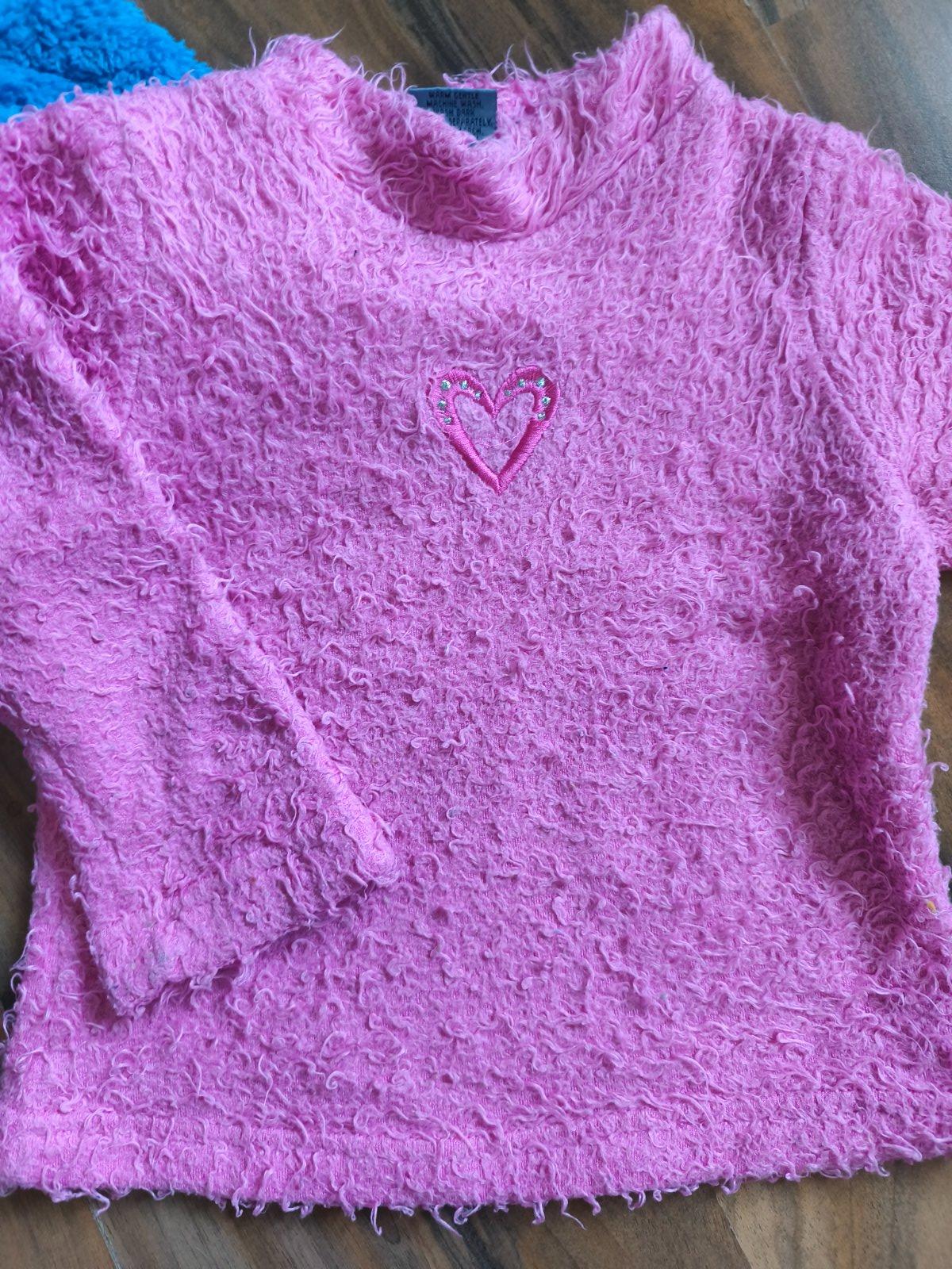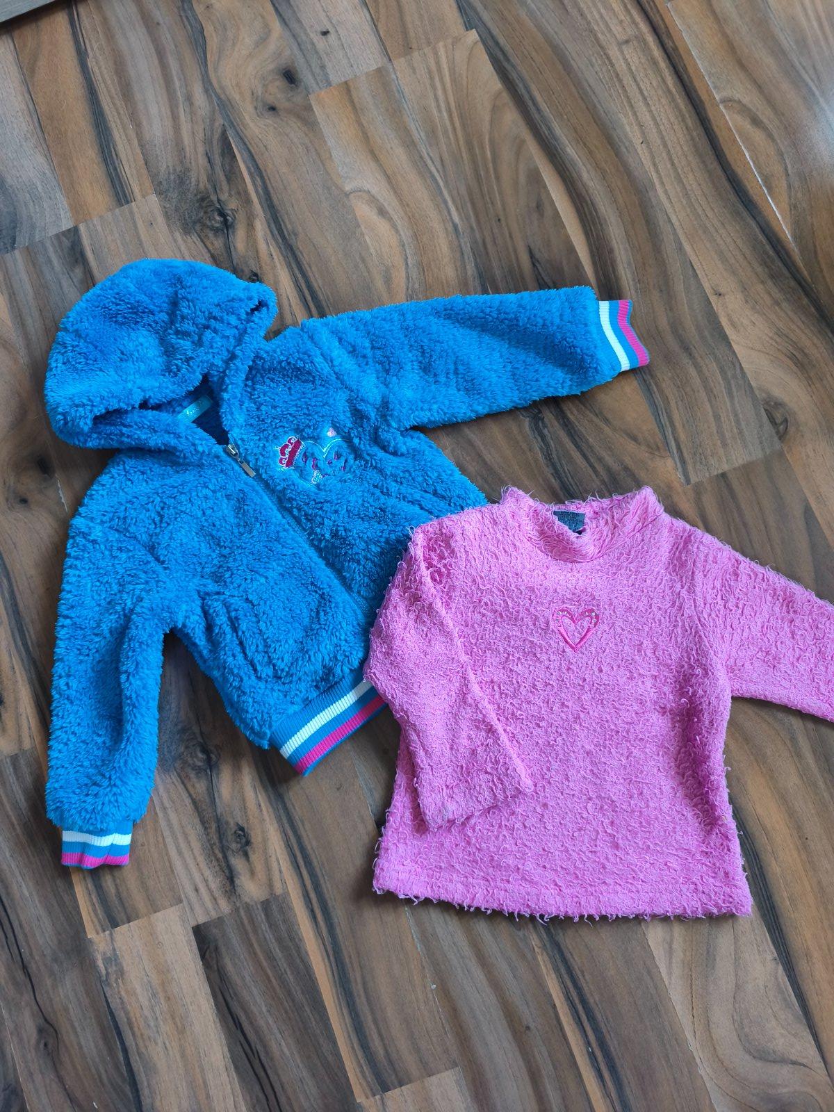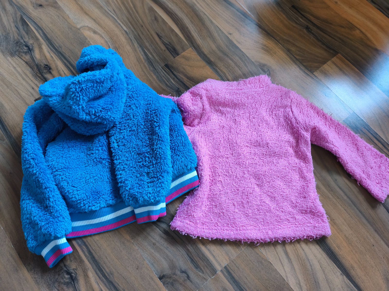 2krát chlupatá mikina - modrá vel 2 (sedí 92/98), párkrát vzatá - 80 Kč, růžová víc nošená, známky praní na chlupu, je slehlý, ale je to takový ten dlouhý, který i při koupi vypadá obnošeně - 30 Kč. Uvedená cena celkem.