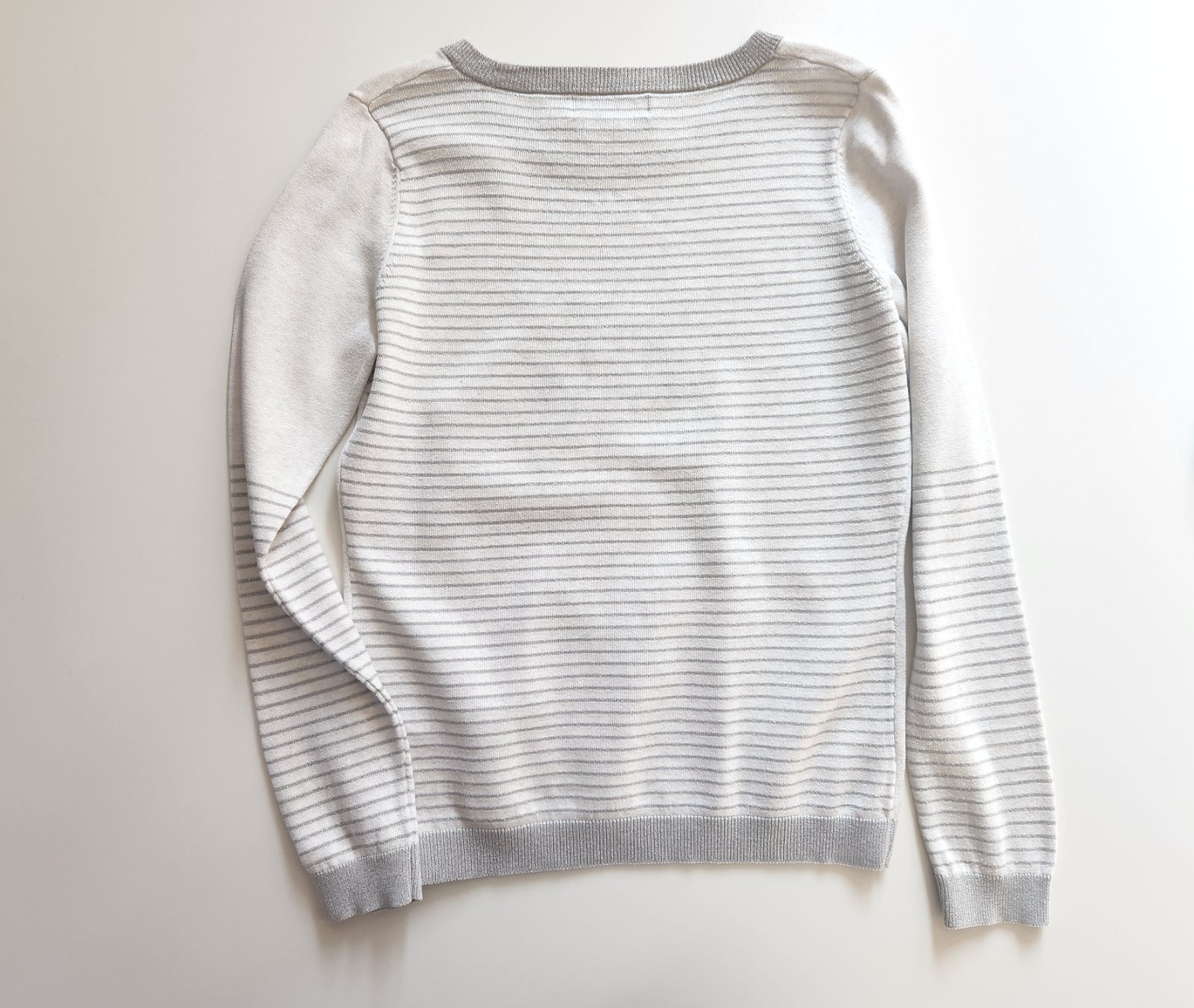 Krémový melírovaný slabý svetřík zn. NEXT, šedý slabý proužek a žebrové lemy doplněné třpytivou stříbrnou nitkou, třpytivý obrázek.