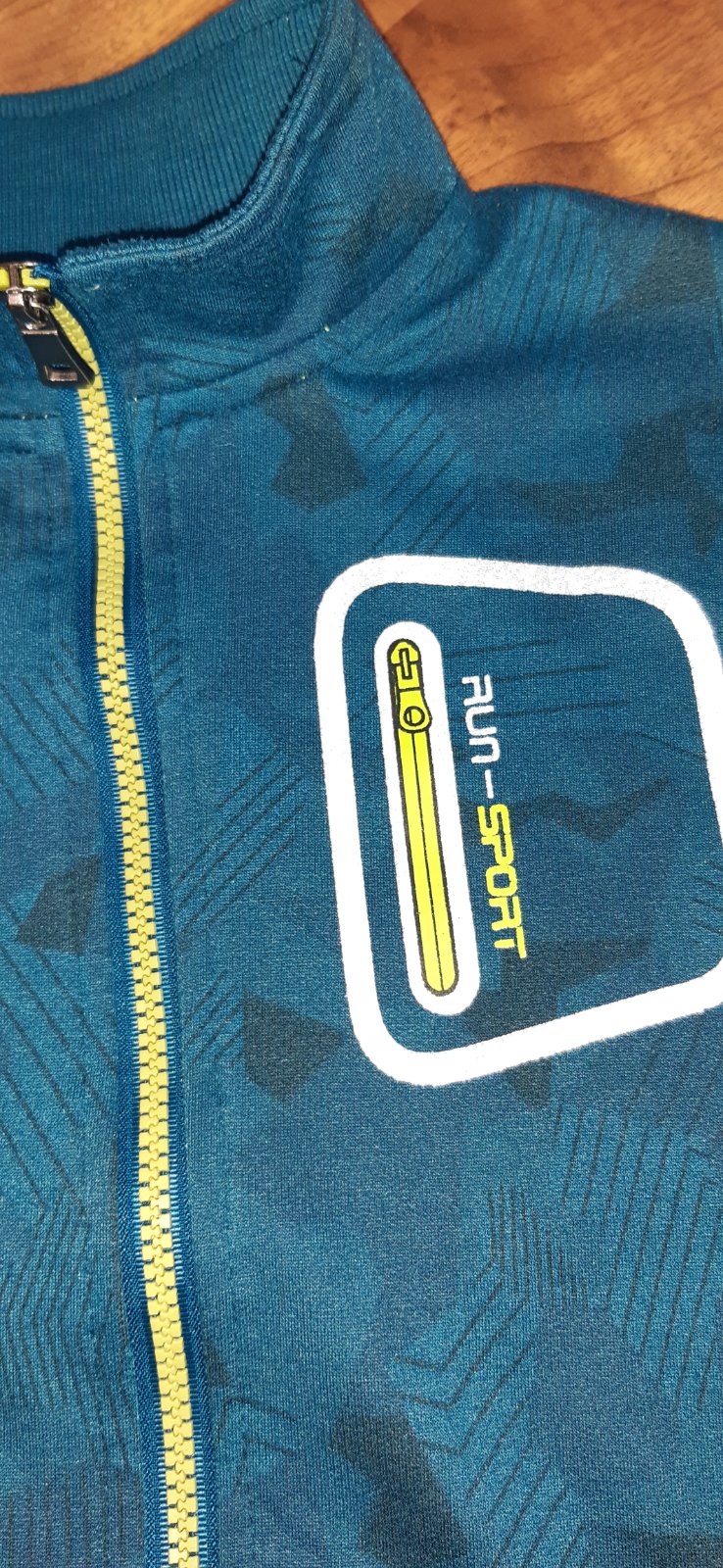 Sportovní propínací bavlněná mikina Kugo 134 Run-sport s reflexním nápisem na rukávu a vepředu viz foto, se stojáčkem u krku a 2 funkční kapsy vpředu. Barva krásně petrolejová, zachycená spíše na detailních fotkách. Skvělý stav, námi kupovaná nová.