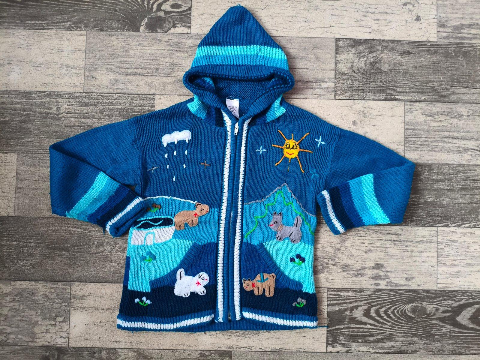 Více nošený a je to znát, ale pěkný barevný pro děti--spíše retro...