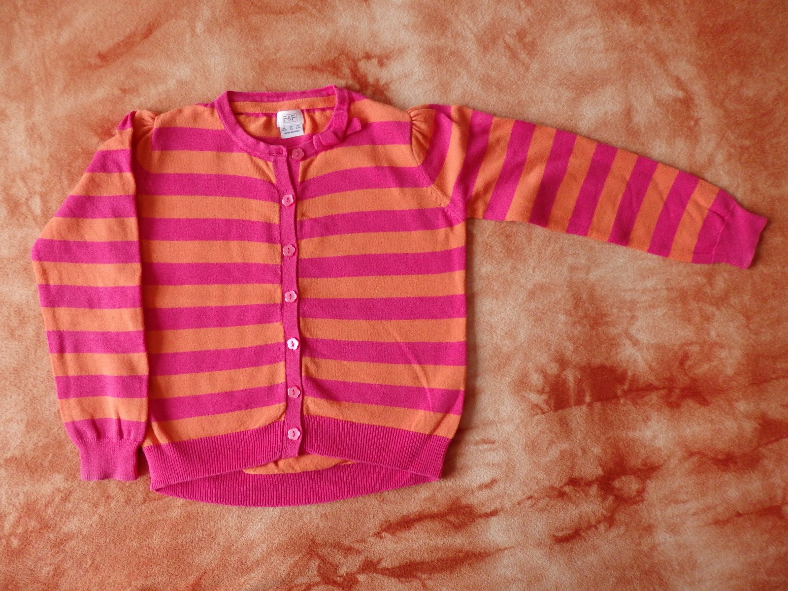 Pěkný růžovo-oranžový svetřík, zapínání na knoflíčky, malá mašlička u krku. V hezkém stavu.