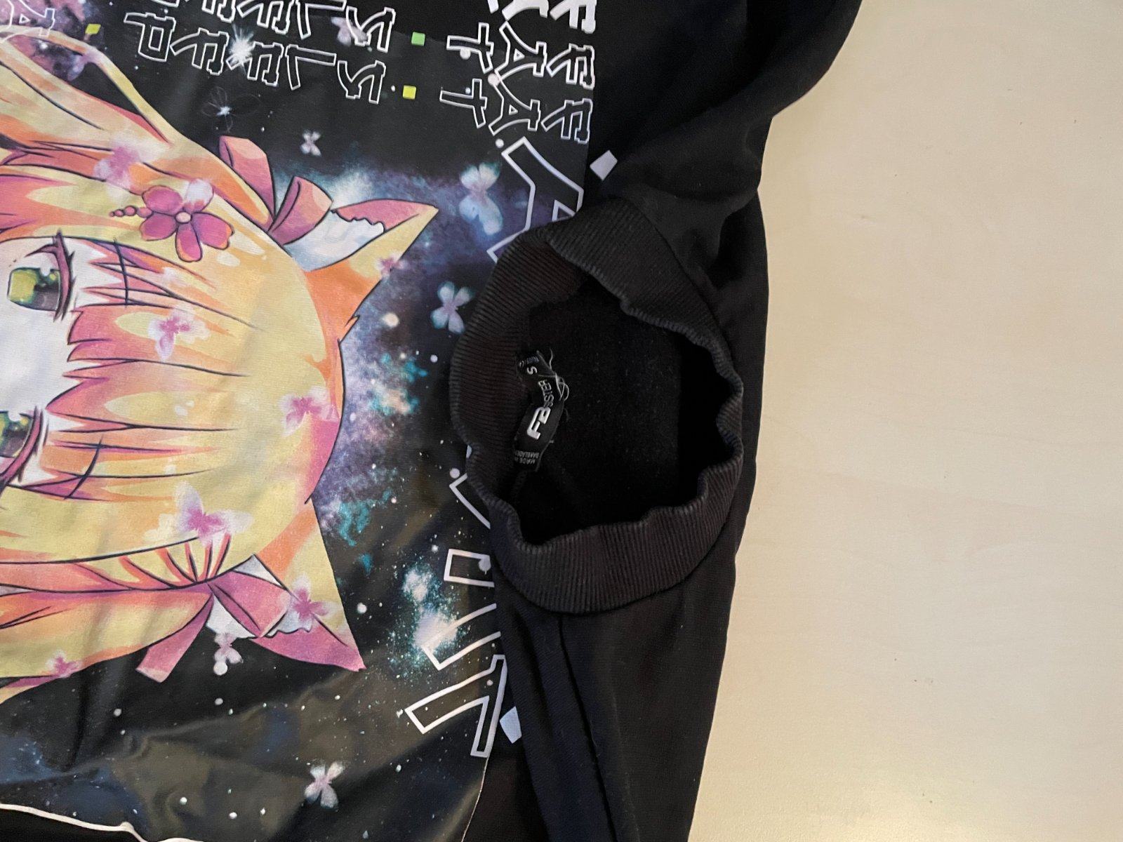 Hol. nabízím delší a krásně volnou černou miminu s anime obrázkem na záda a nápisem na PD a květy na rukávech, vel S, FB sister. Složení materiálu - štítek odstřižen, ale klasická mikina s chloupkem u vnitř, tak bude asi s podílem bavlny. Nošená, bez vad krásná