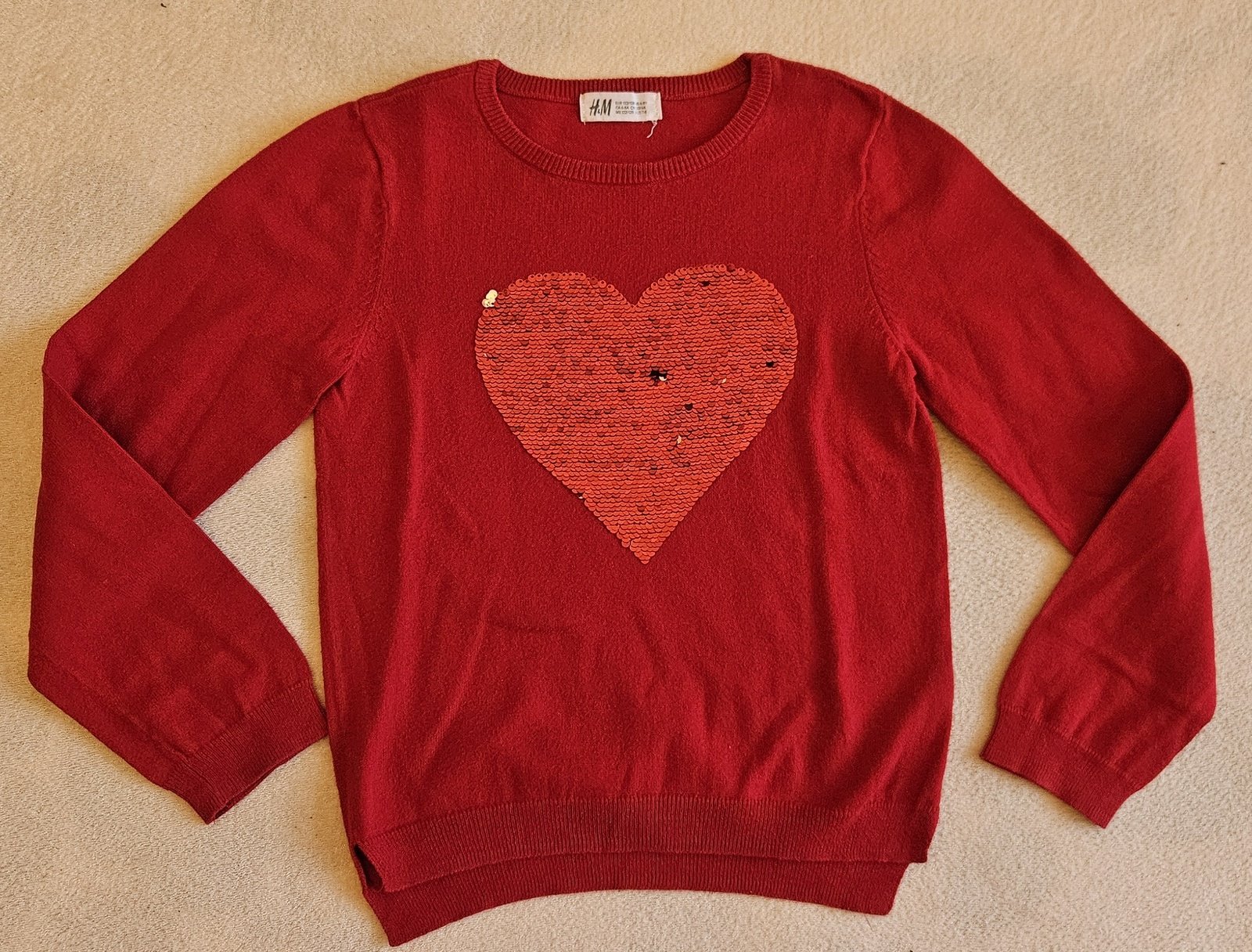 Červený, se srdíčkem, přeměňovací flitry, vel.122/128, H&M
