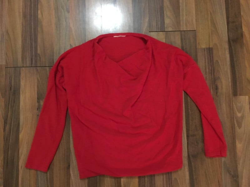 97. Nabízím k prodeji tento jasně červený svetřík s vodou u krku, velikost S , Reserved. Barva jasně červená, ale při natažení pro měření jsem si všimla světlejších čar na PD - nevím jestli od sušení, jakoby šíslé. Není to nic výrazného, při nošení se myslím ztrácí v záhybech, mimo toto krásný stav, nesepraný a výrazná barva, krásný. Složení materiálu neuvedeno, příjemný, pružný úplet.