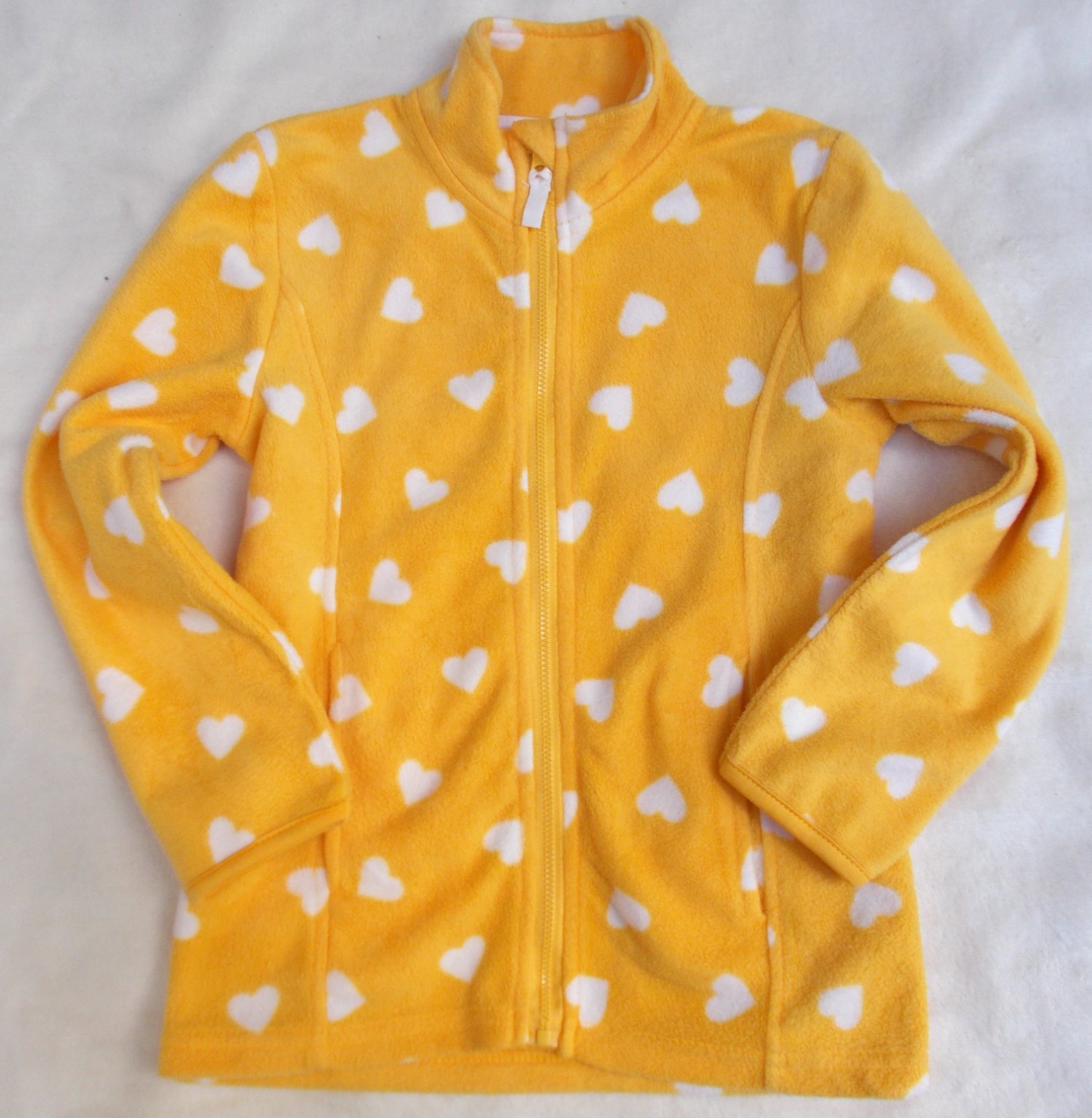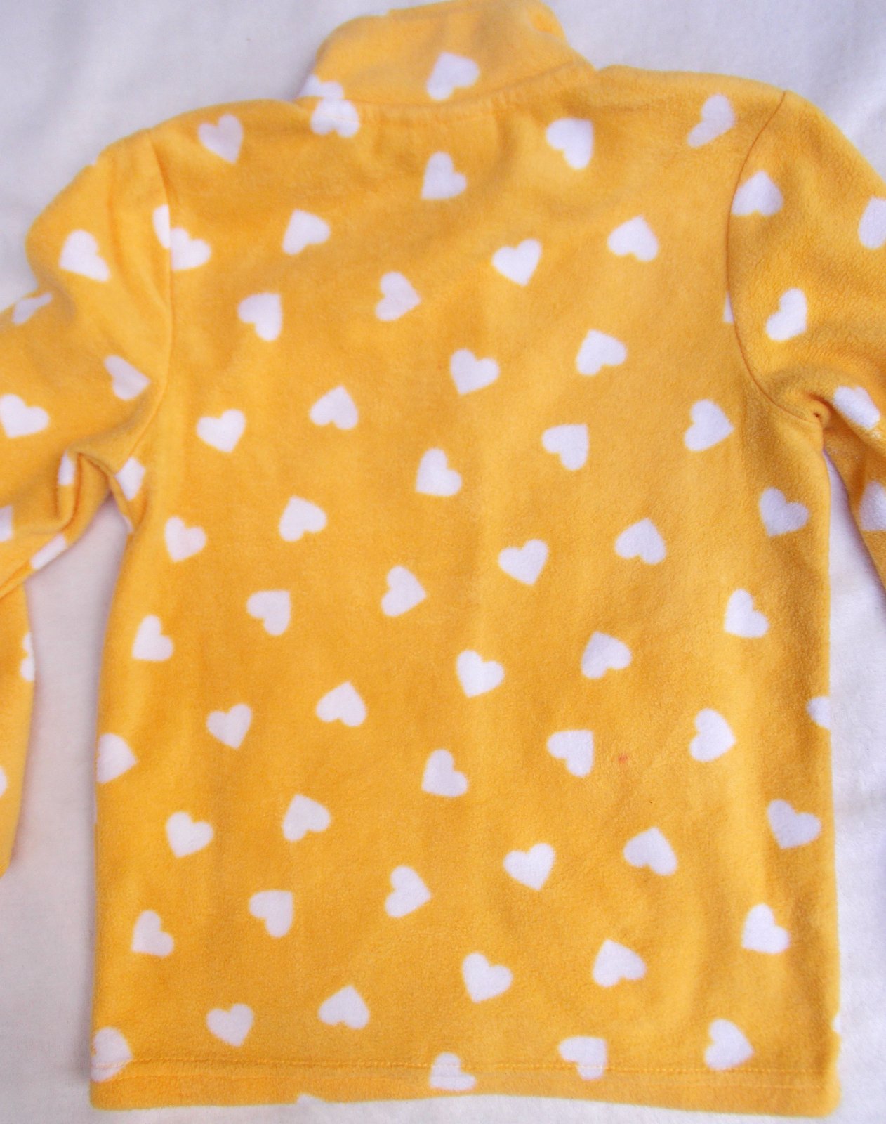 Pěkná žlutá fleecová mikina s bílými srdíčky. Je teplá, fleece je jemný, měkký. Zapínání na zip, dvě kapsičky. Jde zapnout pěkně ke krku, samozřejmostí je ochrana zipu u krku. Mikinka je ve velmi pěkném stavu, jen na zádíčkách malá tečka (od fixy).