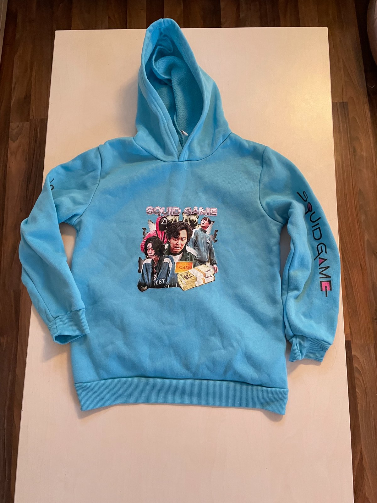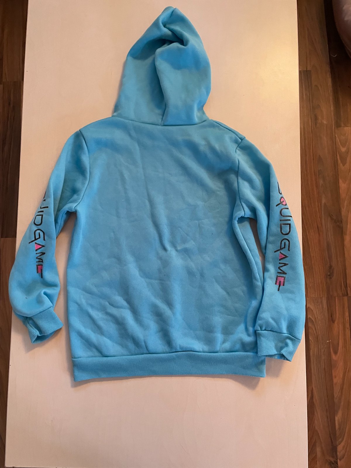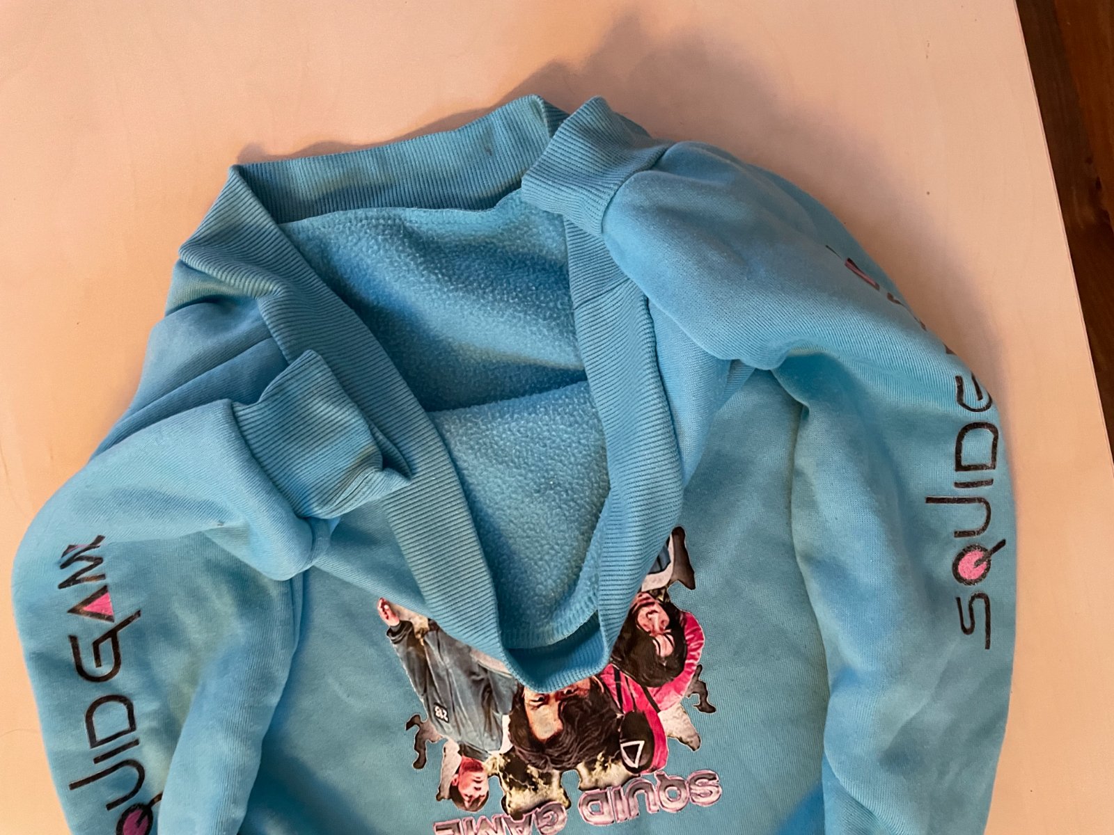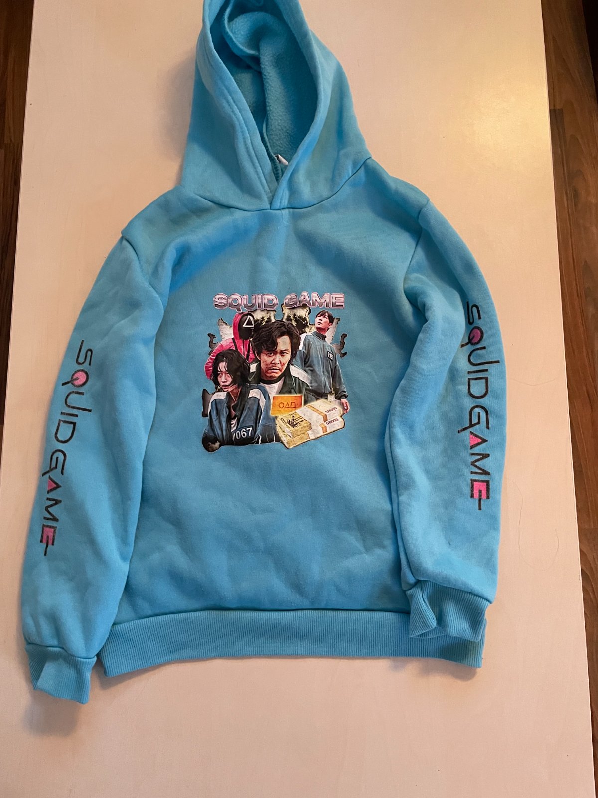 hol. nabízím k prodeji tuto modrou mikunu s obrázkem ze squid game. Vel 150 a myslím i možno XS, měřte jen možná rukáv bude kratší?, dceři byla v 14-15 ok. Materiál umělý, s vnitřním chloupkem jako u mikin. Nošená málo, bez vad, jen nažehlovačka má bublinky, ale to už z výroby - čína, krásná