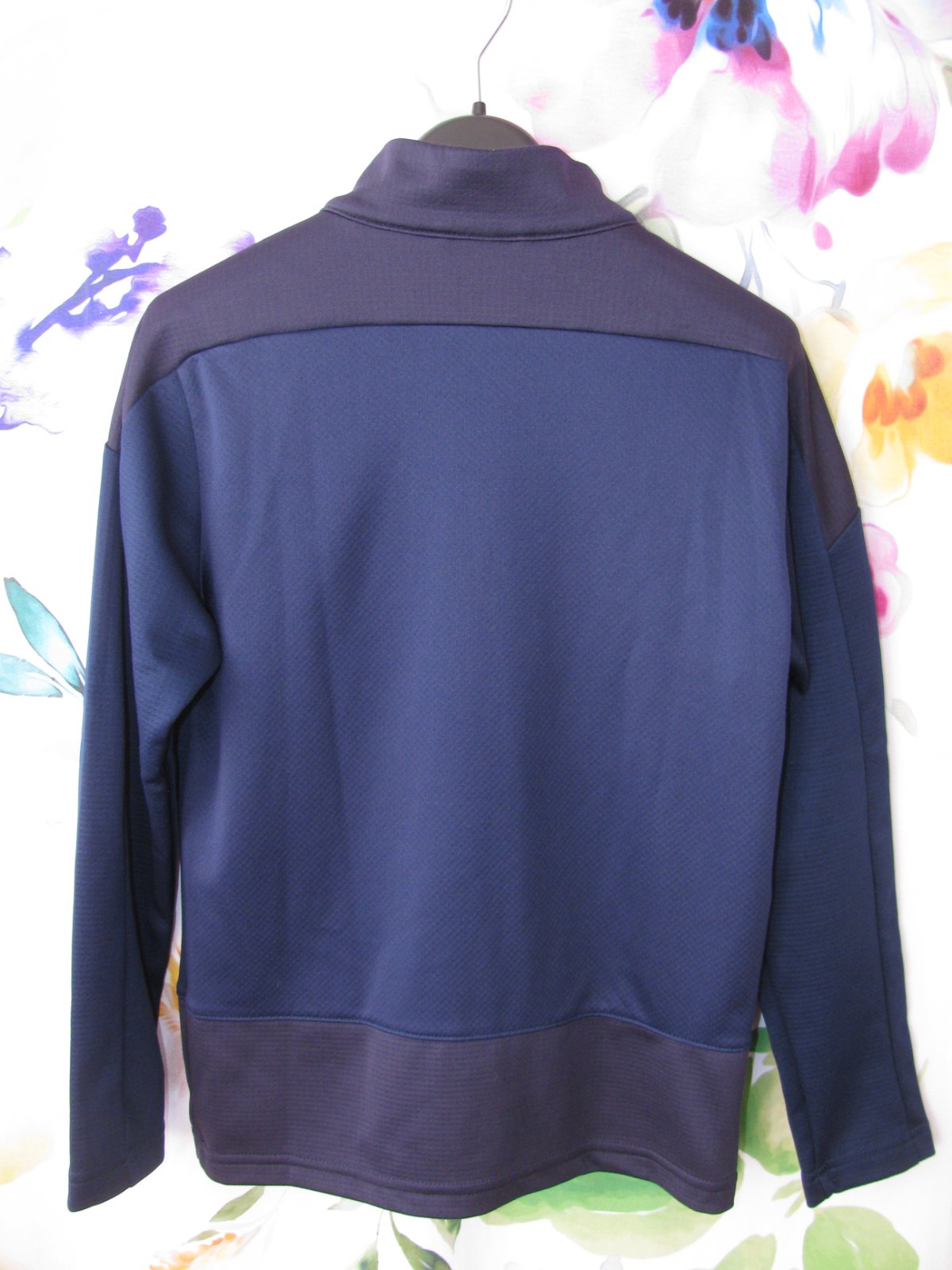 Perfektní tmavě modrá elastická mikina, krátký zip pod krkem, logo, 100% polyester. PC vysoká, nestačili jsme vynosit, musím prodat.