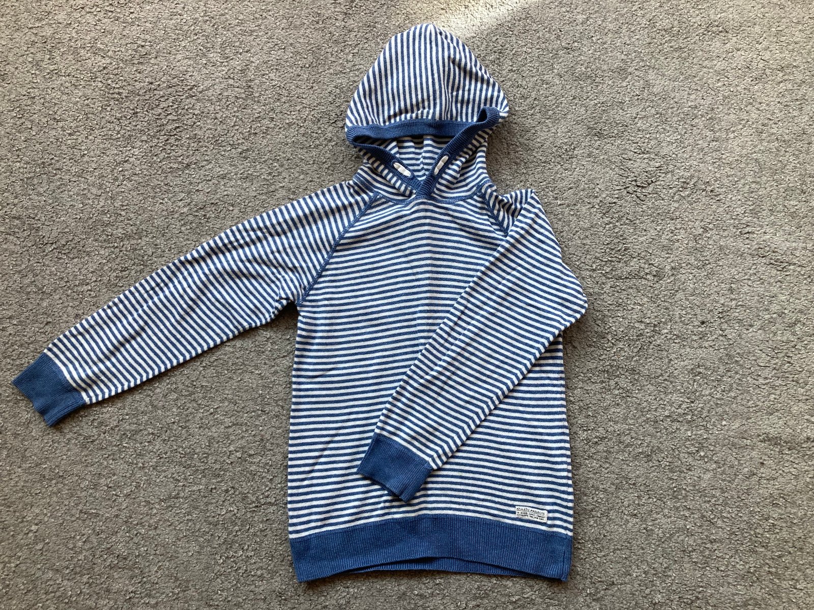 Pruhovaný modro-bílý svetr s kapucí po synovi. Velikost 134/140.