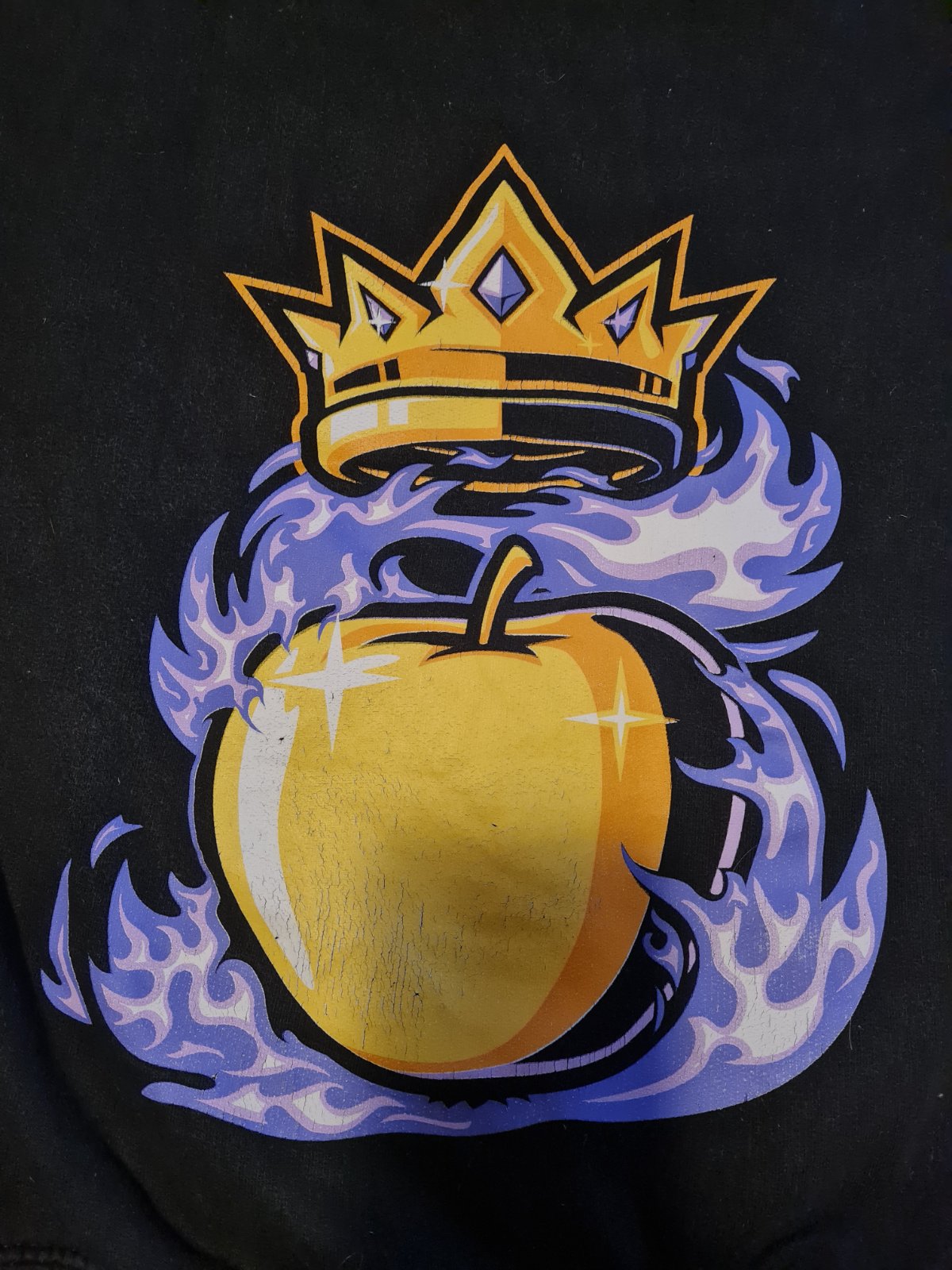 Zakoupena nova, barva jiz neni uplne syta, bez der, obrazek jablka na zadech popraskany, nositelna od 146