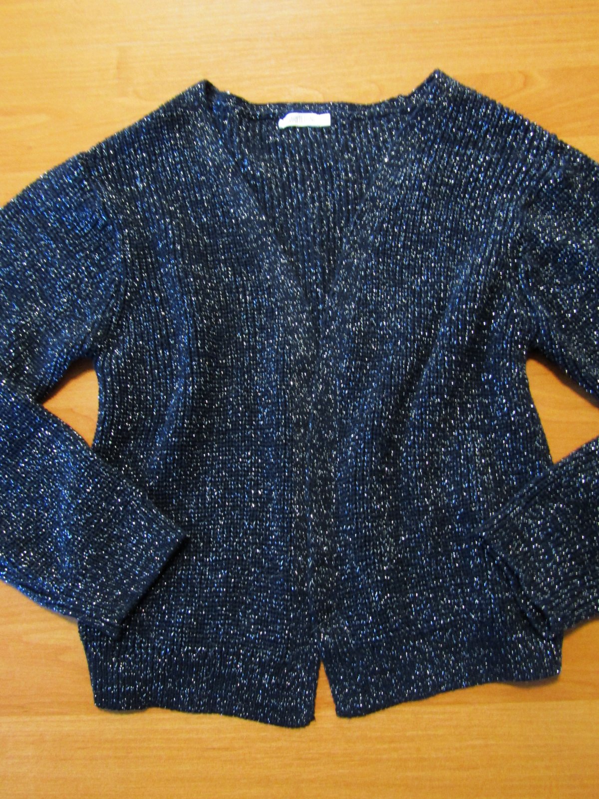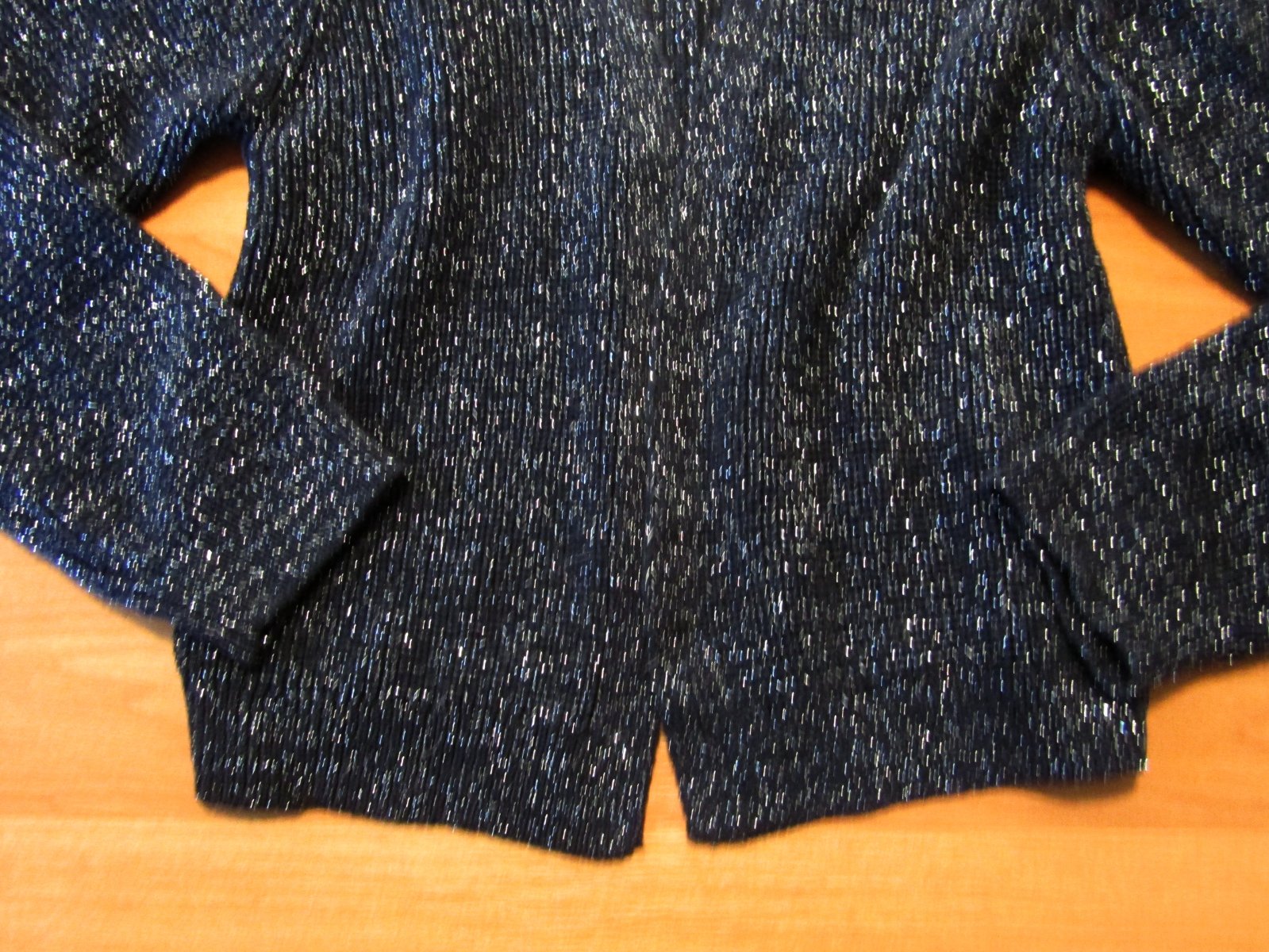 modrý kardigan vyšívaný stříbrnou nitkou super stav šířka 42 cm délka 53 cm délka rukávu od krku 64 cm