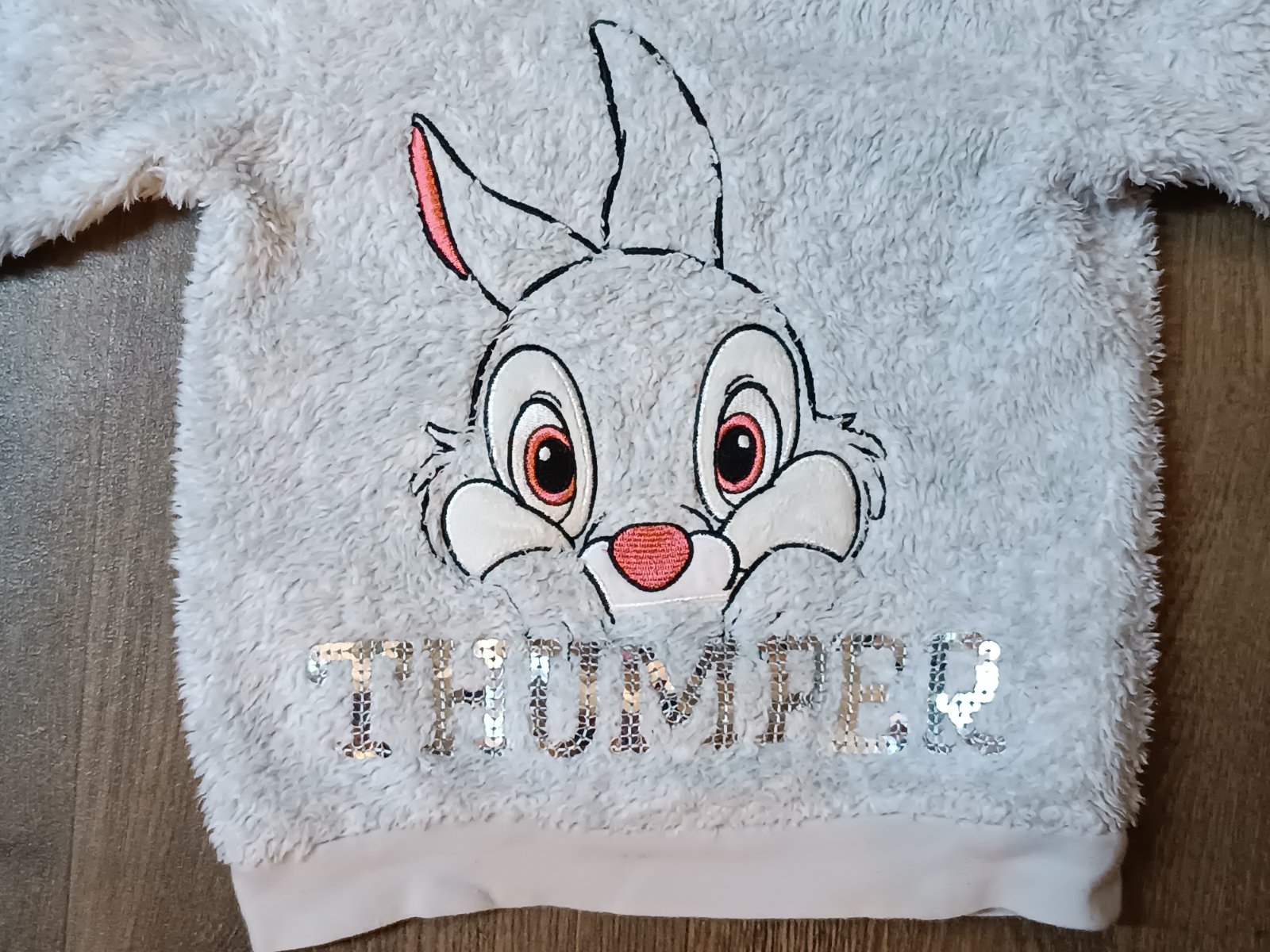 1)chlupatková mikina s motivem králíka a s flitry, zn. Disney, nošená chvíli, pěkný stav