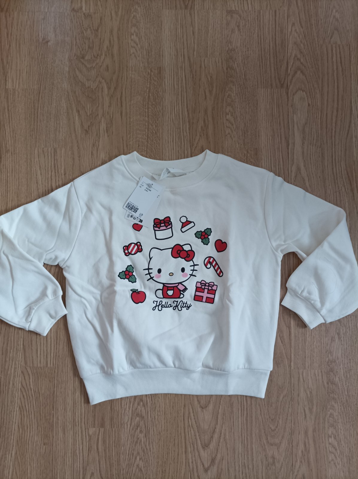 Nová mikina s Hello Kitty, s měkce česanou vnitřní stranou, barva krémová, uvedená velikost 122/128. Je nová, originál zabalená, s visačkou.