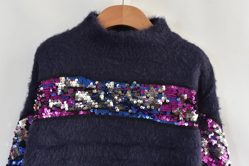 tm. modrý, chlupatý svetr.
