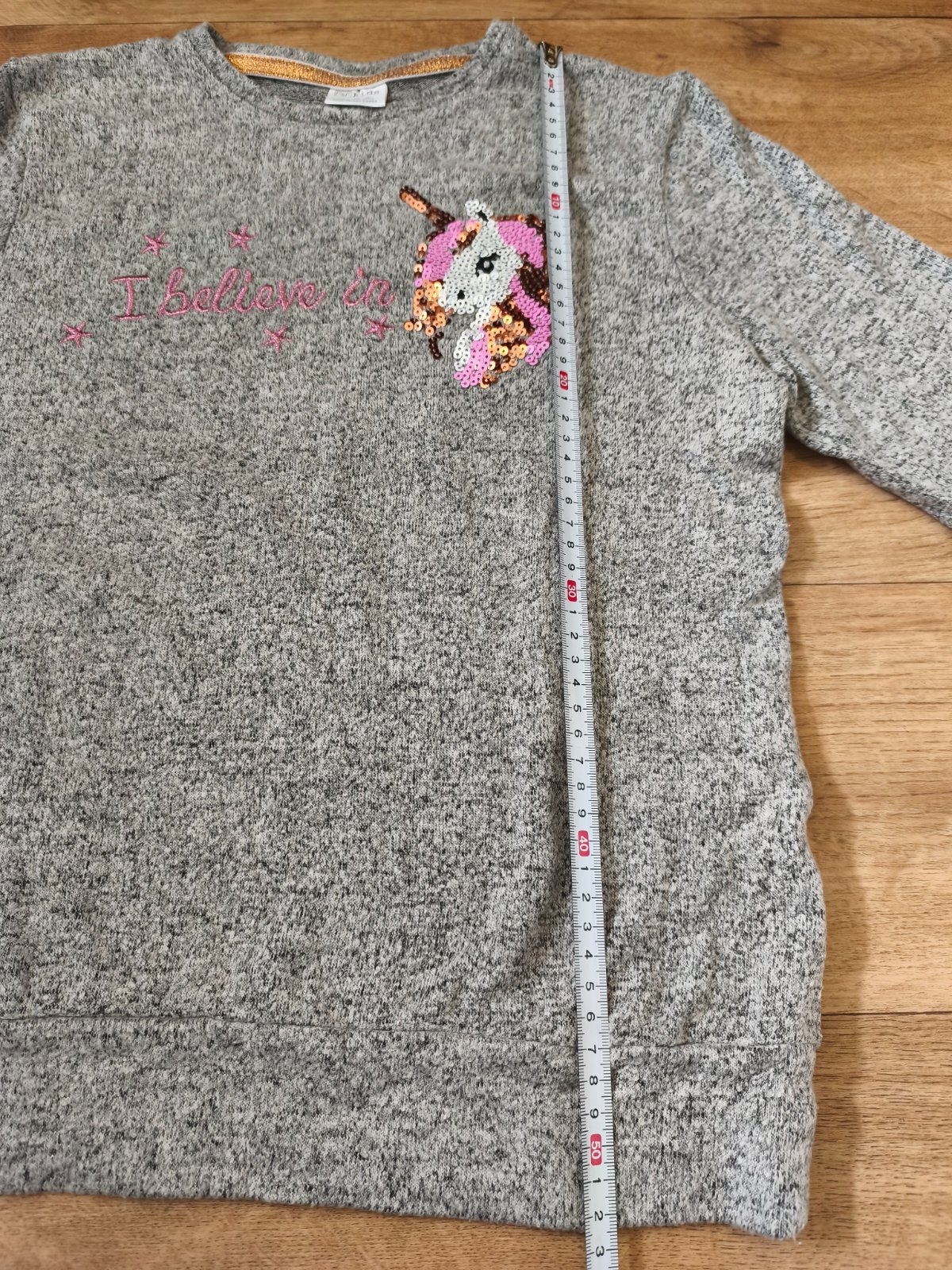 Šedý tenčí svetřík s flitrovým jednorožcem, chlupatá aplikace na rukávech. Velikost 146/152 - rozměry na fotkách. Značka F&F.