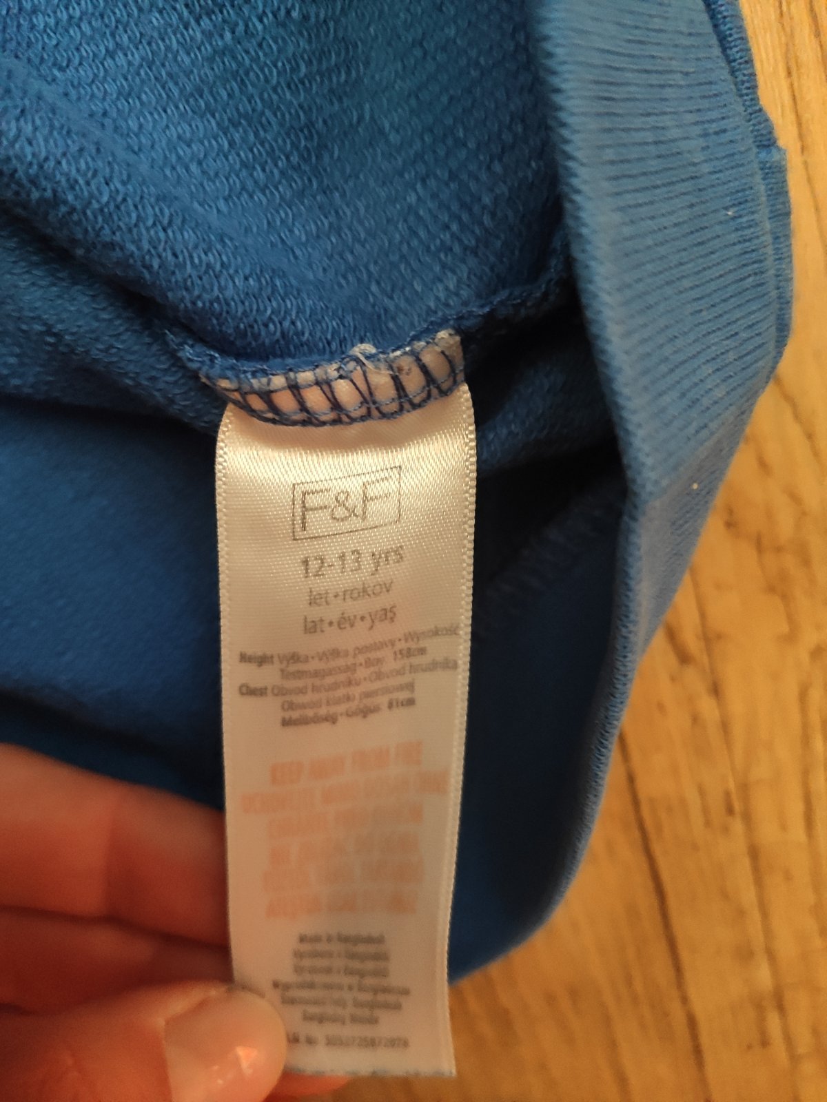 Modrá mikina s potlačou na prednej i zadnej strane, zn. F&F, velk. 152 (11-12 rokov), vnútorná strana flees, dĺžka - 59cm, rukávy (od krku) - 61cm. Vsuper stave.