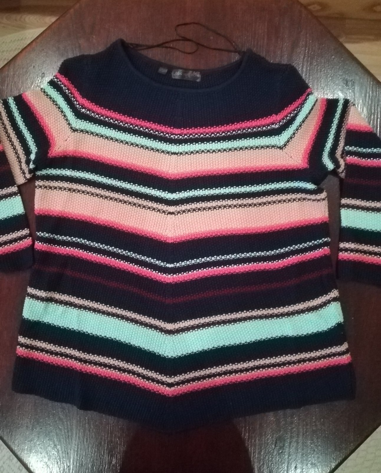 Pekný teplý pletený pulóvrik netradičného strihu. Je to číslo 44/46 ale je väčší. Elastický, cez prsia 2 x 58 cm (povolí o 2 x 7 cm), dĺžka min. 69 cm, cez brucho o niečo viac. Oblečený asi 2x, žiadne známky nosenia. Vysoký podiel bavlny - 49%.