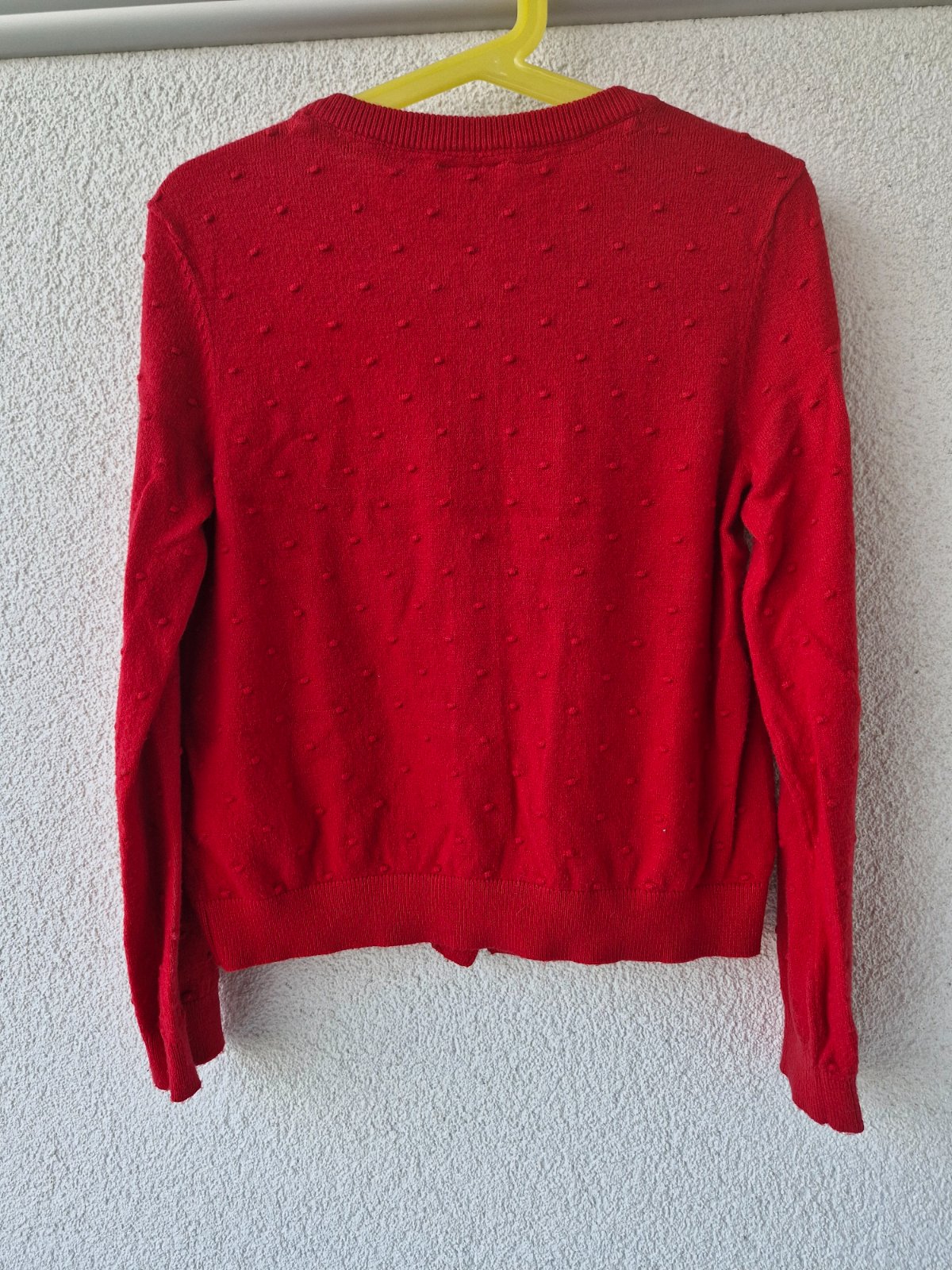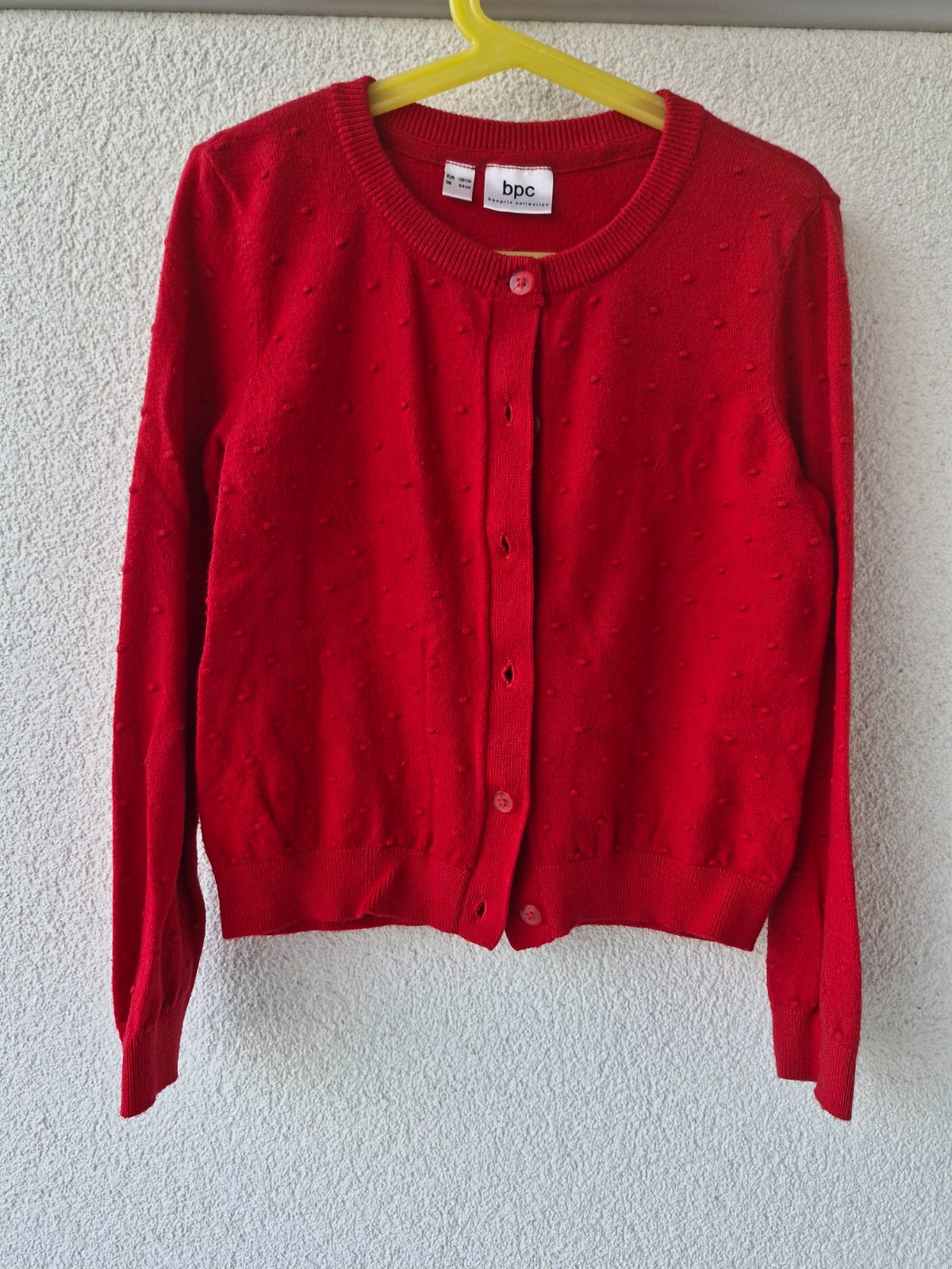 Červený svetr na knoflíčky uvedená velikost 128/134, značka bpc. Svetr je málo nošený bez vad a fleků.