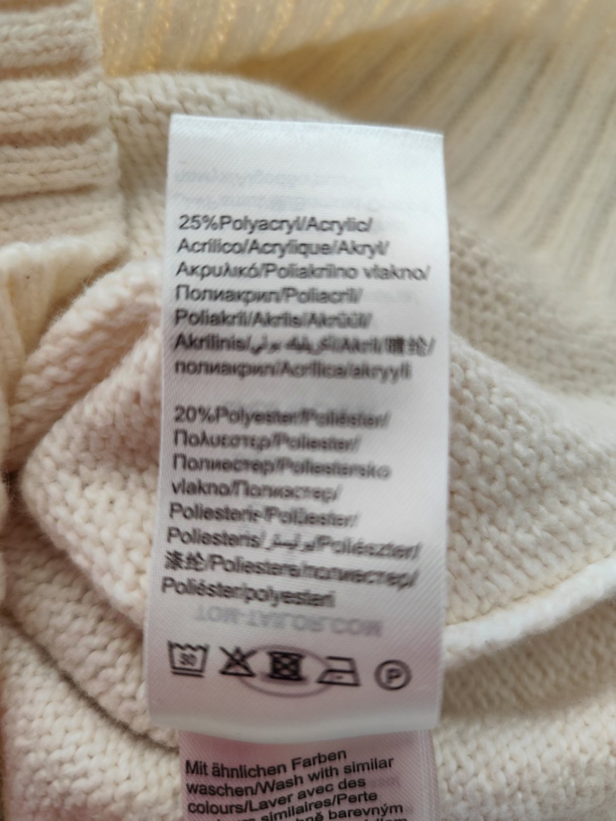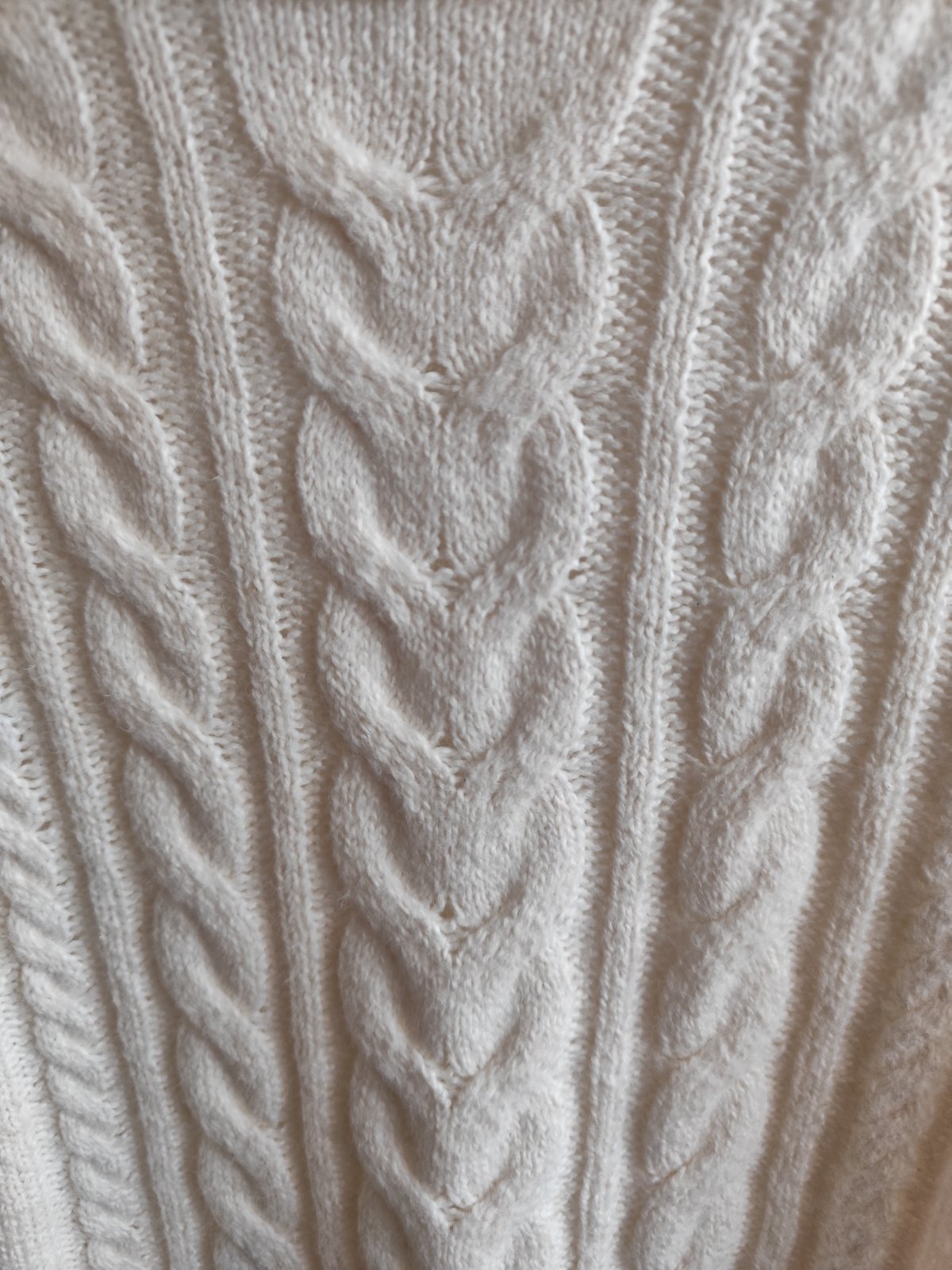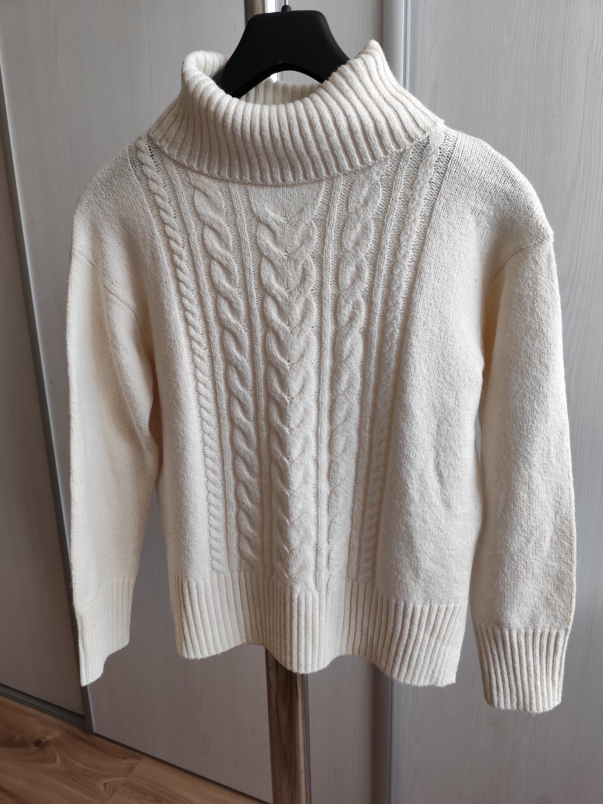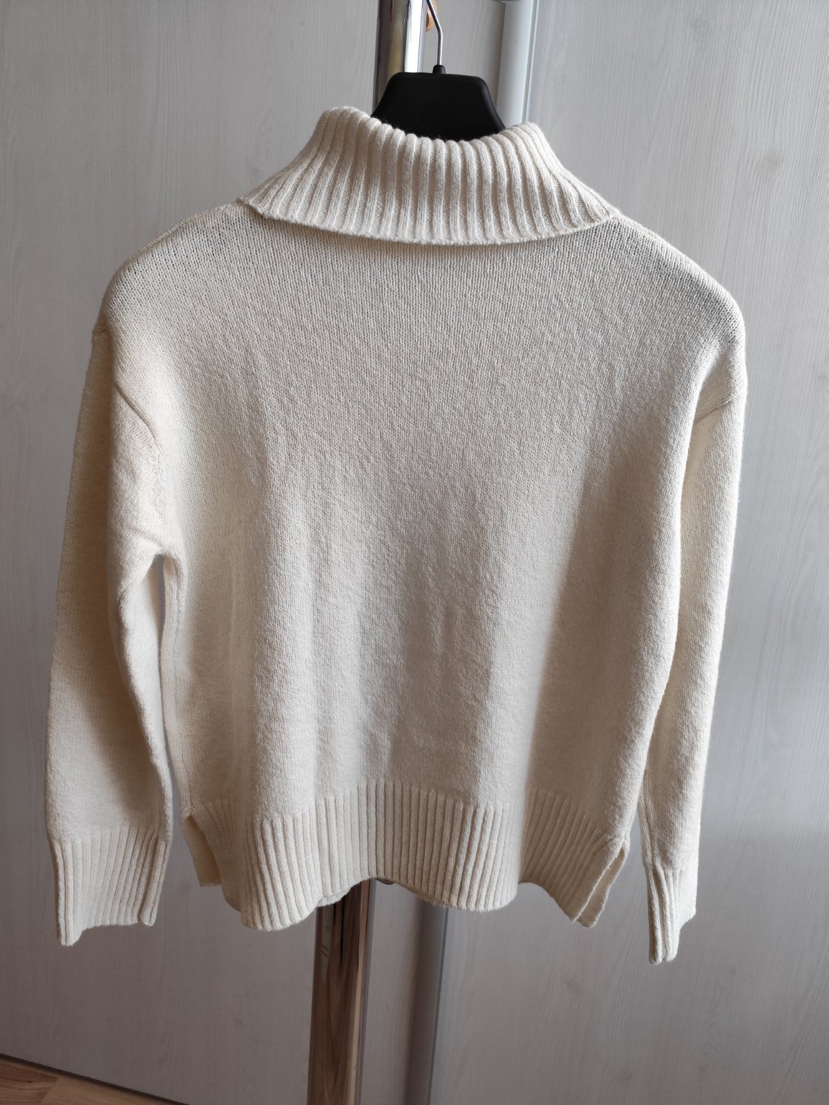 Teplý značkový, veľmi príjemný rolák vo veľmi dobrom stave. Označený č. "S", ale je elastický a cez prsia má v kľude 2 x 50 cm (povolí o 2 x 10 cm). Dĺžka 58 cm, po stranách rázporky. Zloženie: 55% bavlna + 25% akryl + 20% polyester. Nie je sneho-biely, ale s nádychom do krémova.