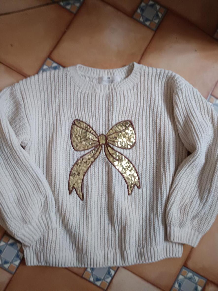Ve skvělém stavu bez vad protkaný stříbrnou nitkou, vel. 8-10 let, 134/140. ROZMĚRY: délka od ramene 53cm, šířka 38cm x 2, rukáv od ramene 53cm, od podpaží 39cm. ZNAČKA: H&M VELIKOST: 134 POŠTOVNÉ:...