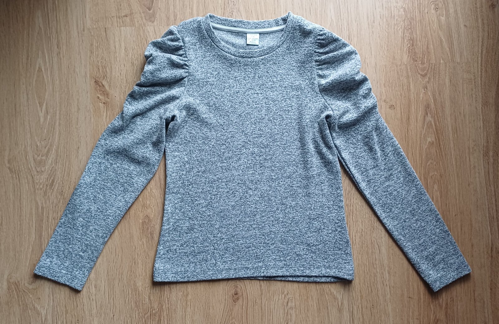 Sedí na velikost 134/140, šedý svetr se stříbrnou nití