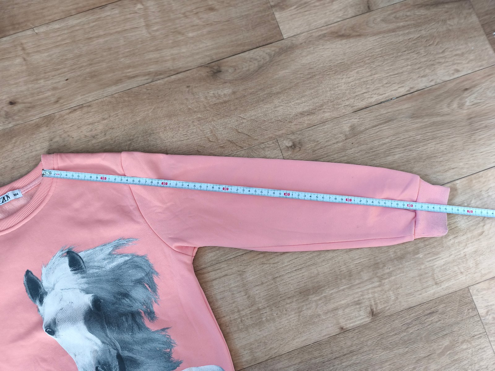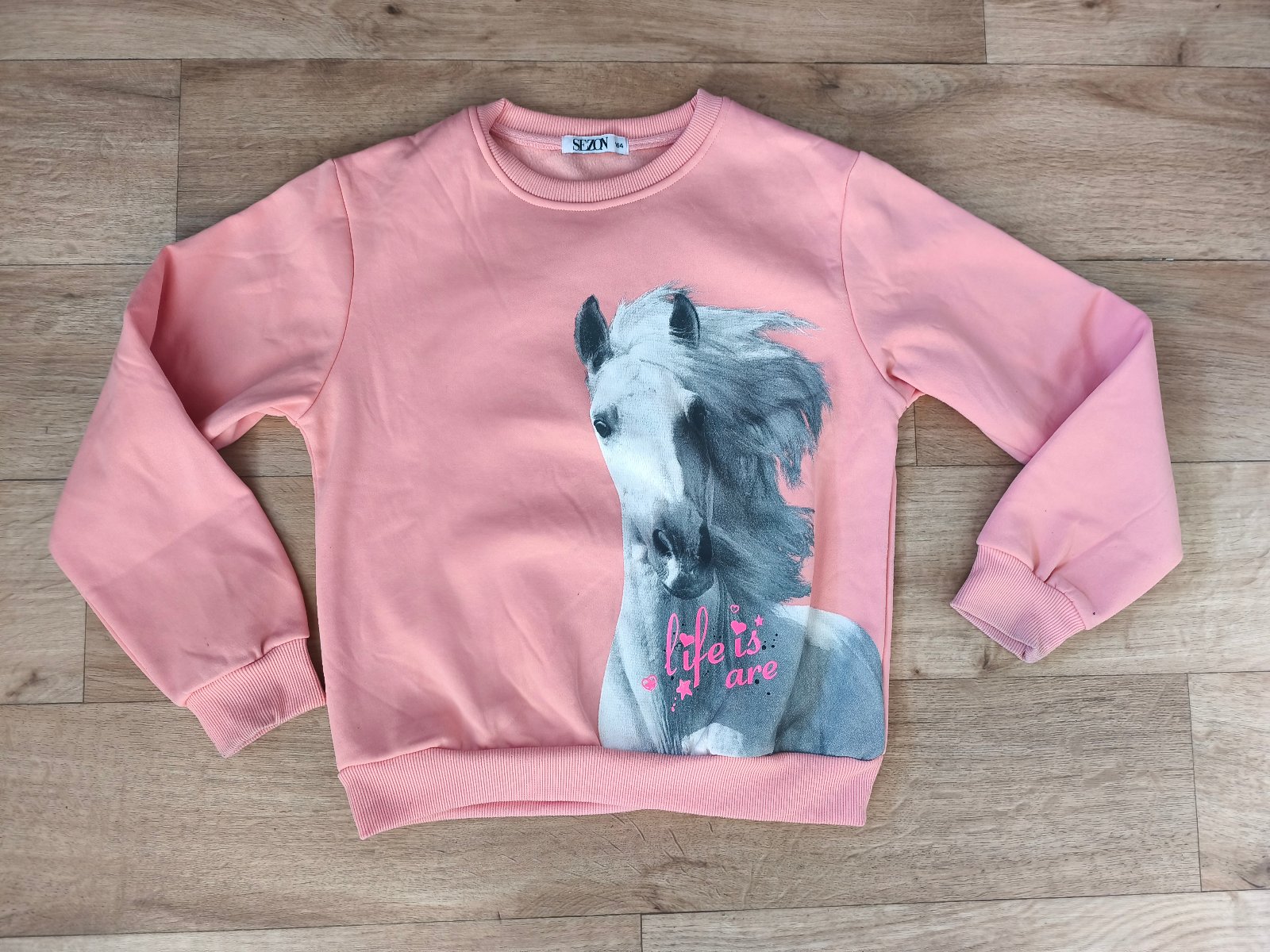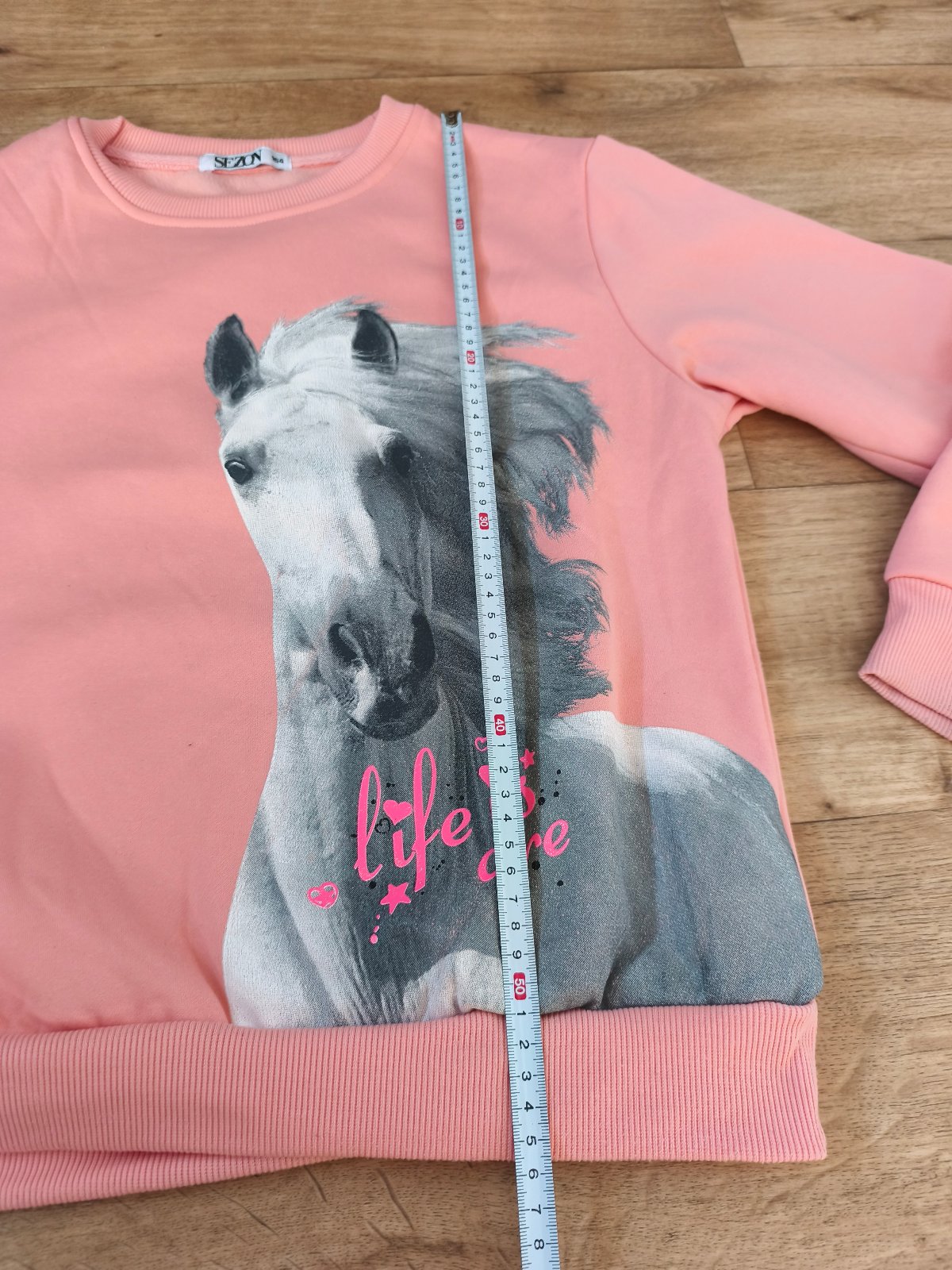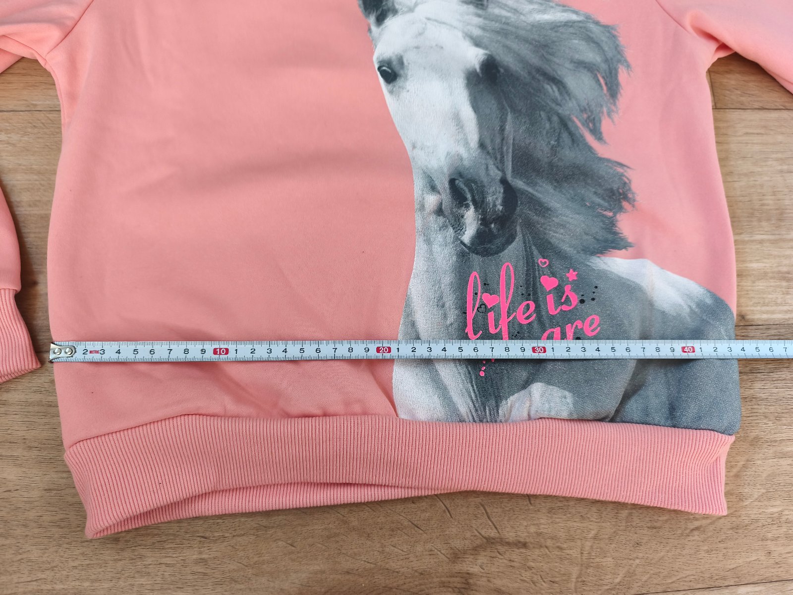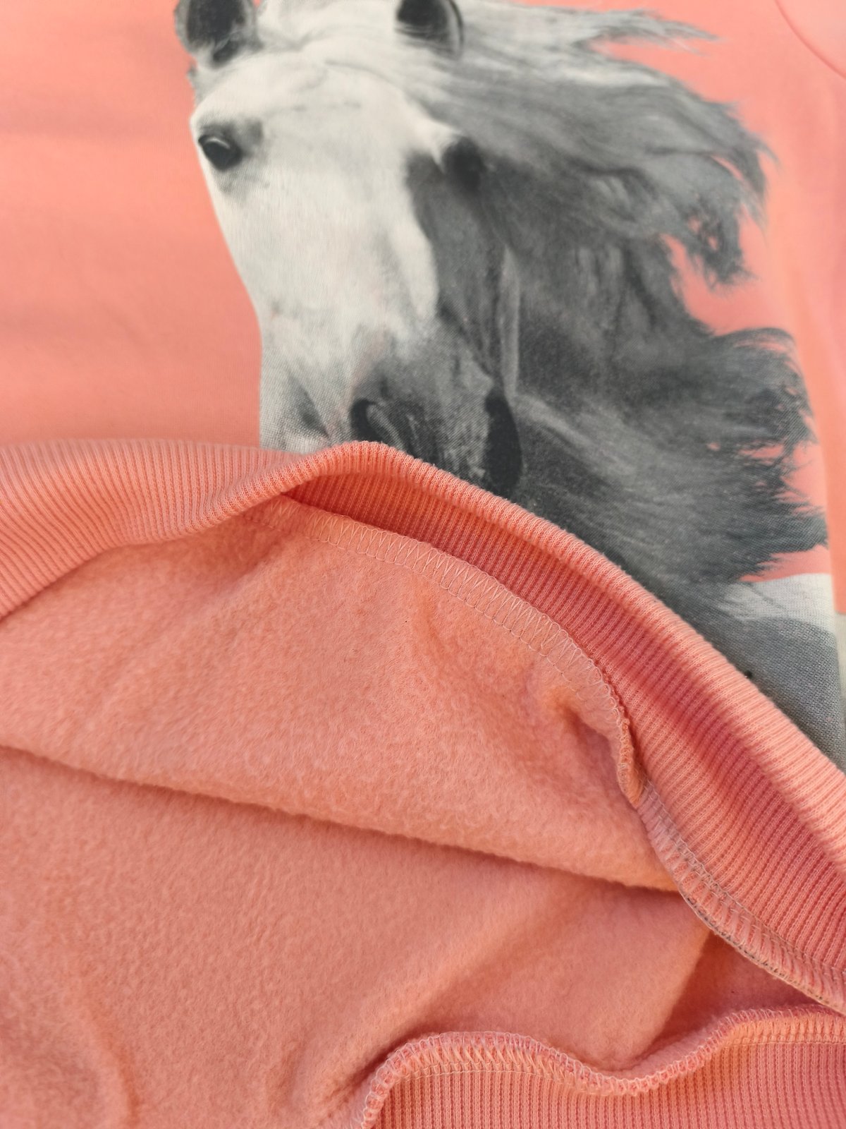 Světlerůžová teplejší mikina s obrázkem koně. Obrázek nepoškozený, mikina téměř nenošena. Velikost uvedena 164, ale raději měřte - rozměry na fotkách.