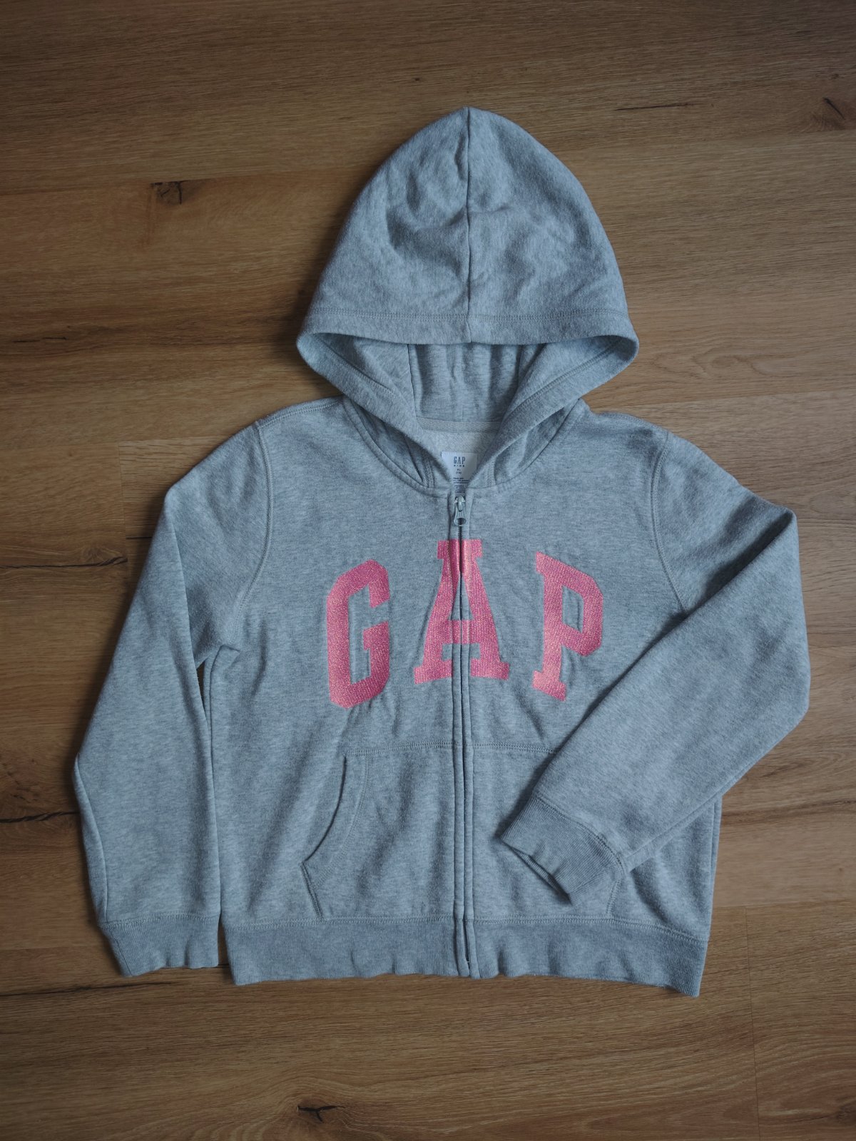 Dívčí propínací mikina GAP XL (12 let) s kapucí, uvnitř chloupek, teplejší. Barva světle šedá s vyšitým logem GAP třpytivou růžovou nití viz foto detail.