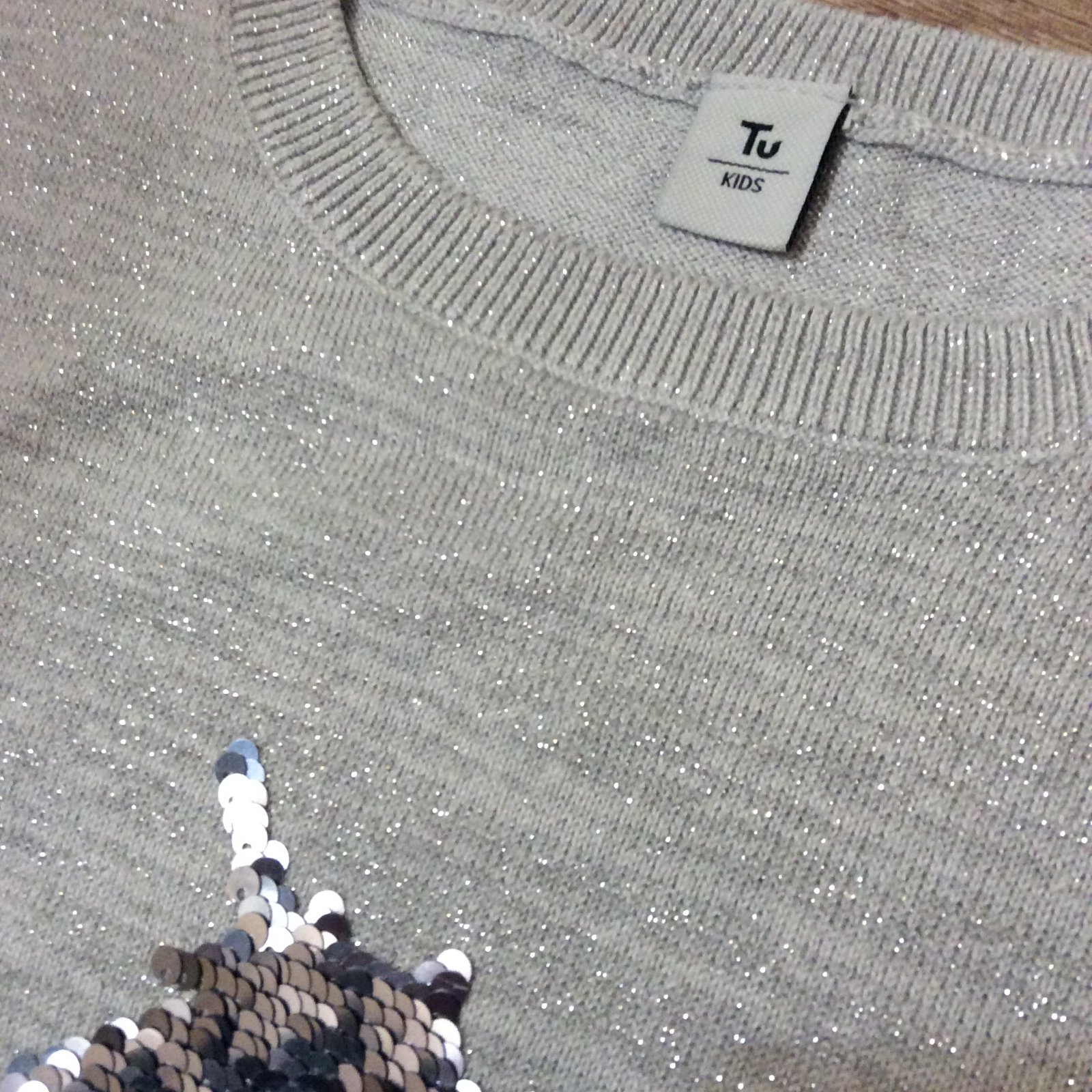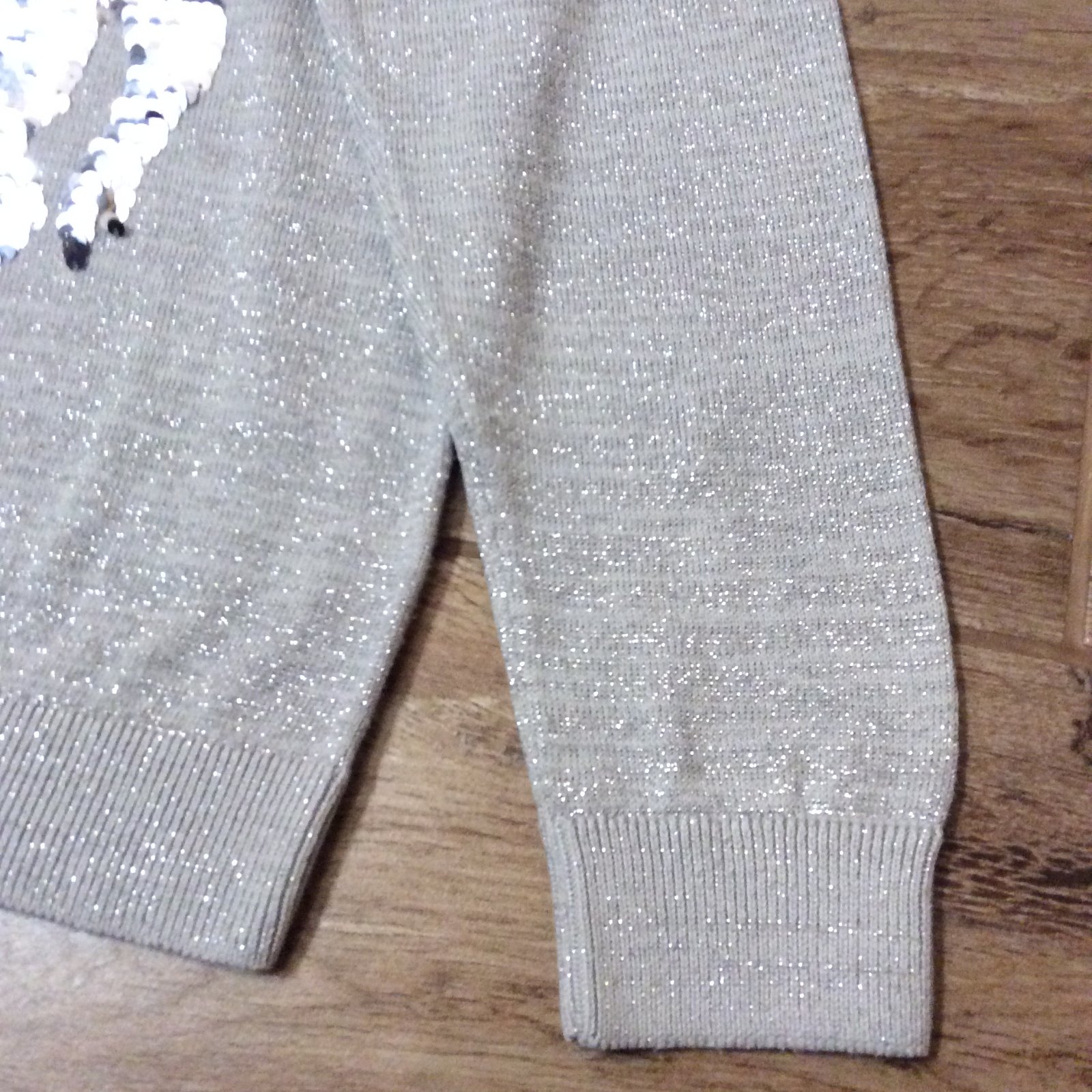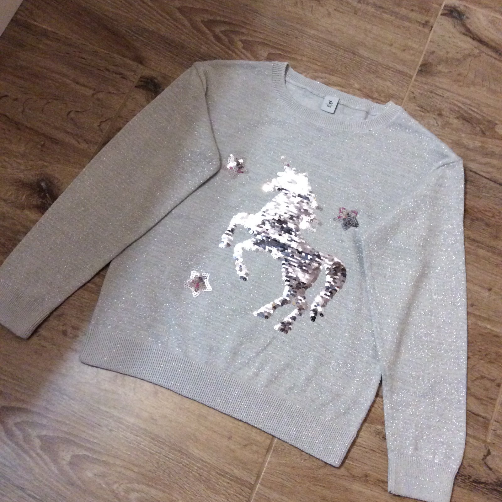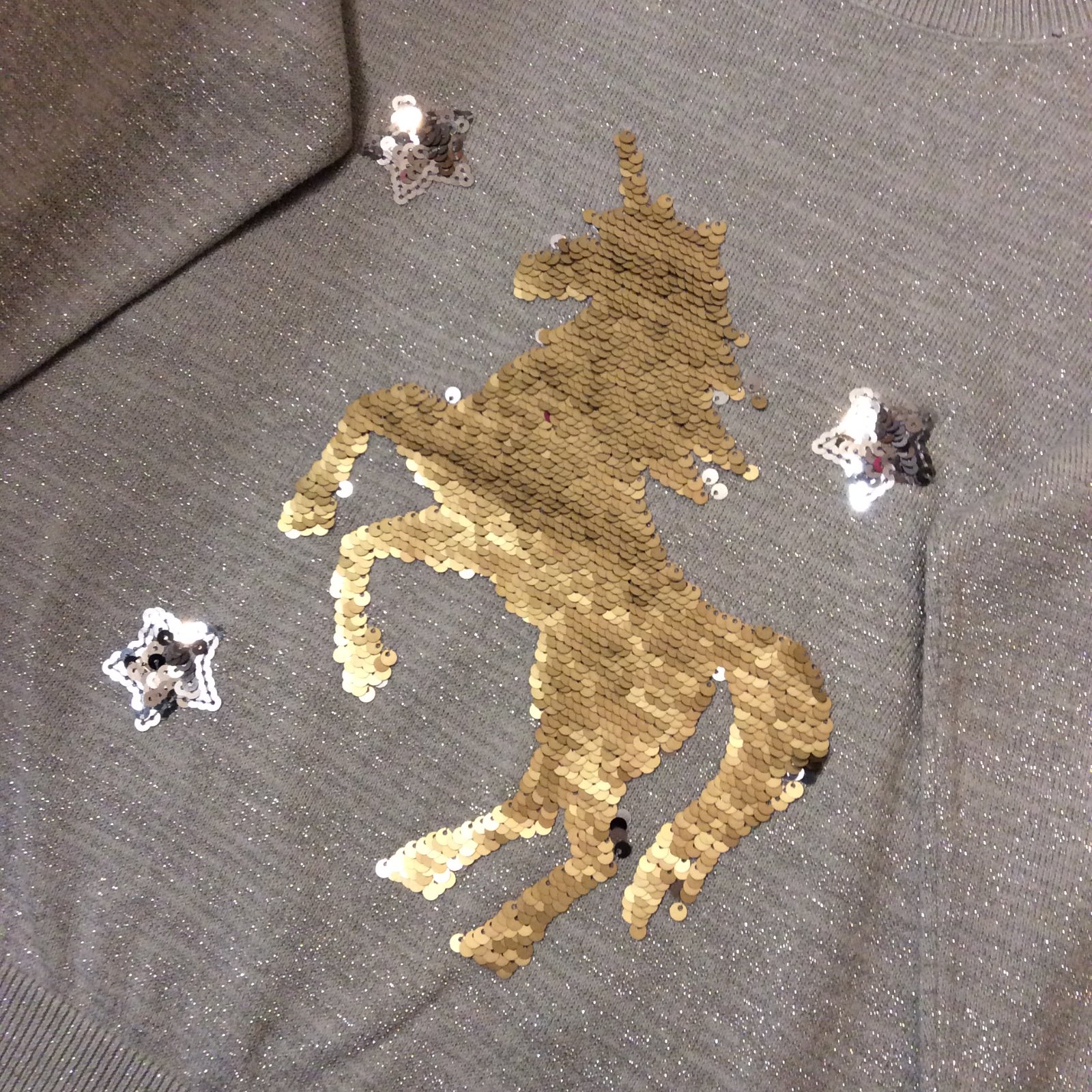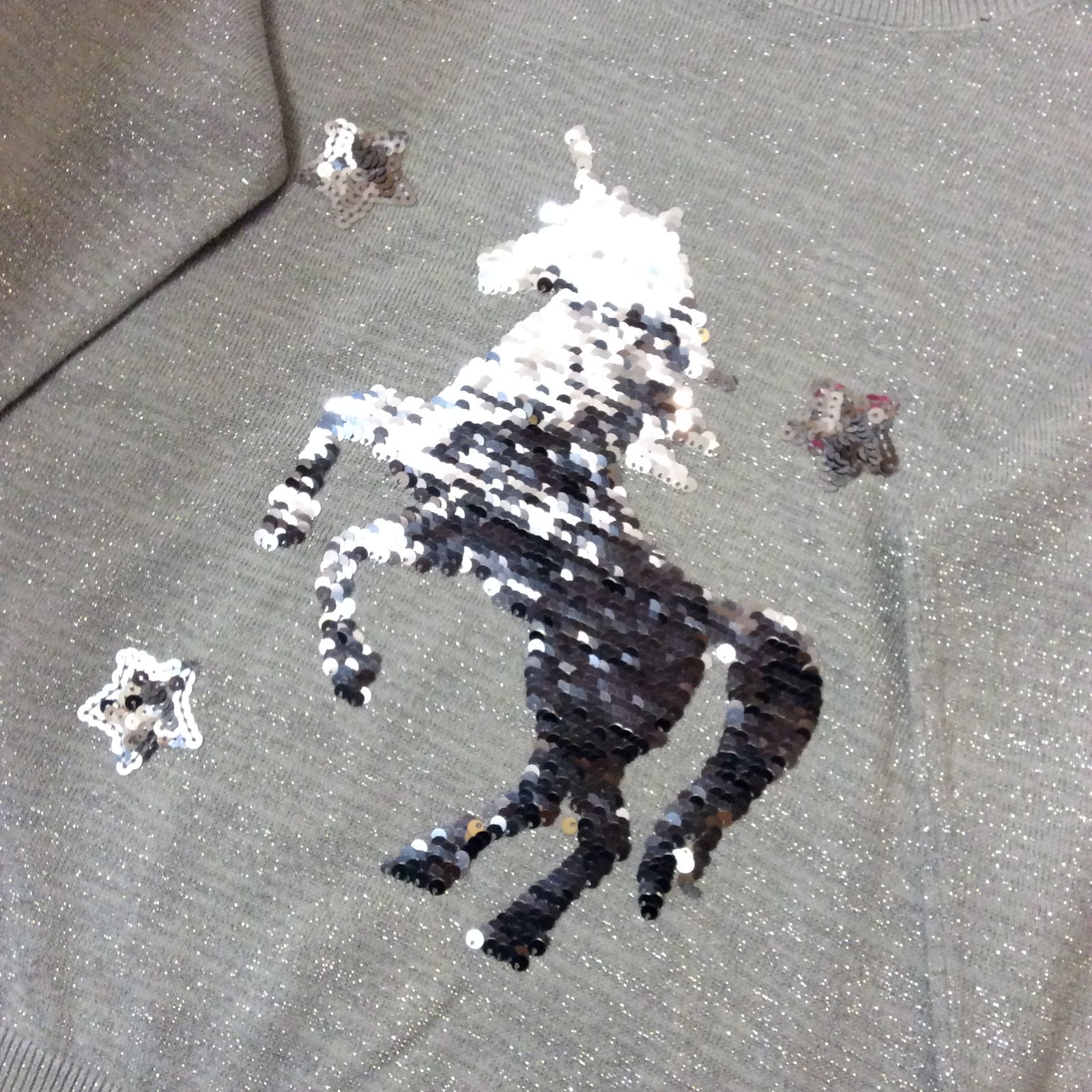 - nádherný úplně JAKO NOVÝ slavnostní celý třpytící - prošitý stříbrnou metalickou nití svetřík s překlápěcím jednorožcem