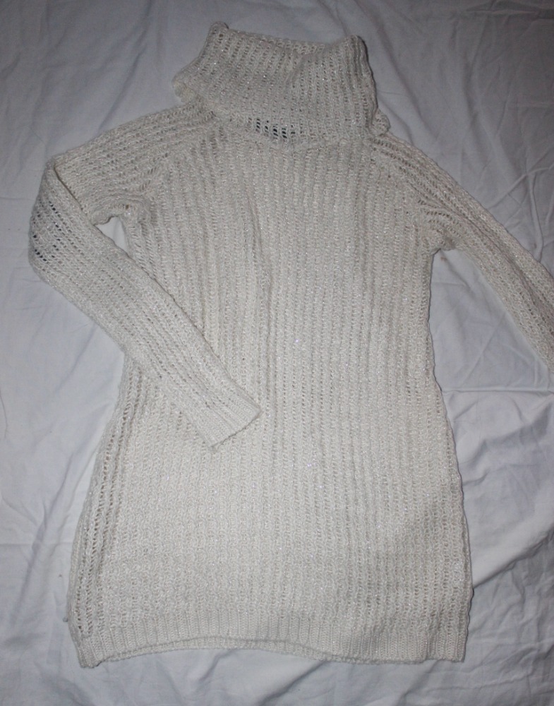 Vyřazeno z přeplněného šatníku naší Viki, dlouhý rolák, eventuálně mini šaty k legínám. Ve velmi dobrém stavu, bez vad, velmi málo vynošeno, parádní "řídký" vzor s velkými oky, smetanová barva+stříbrná nitka.