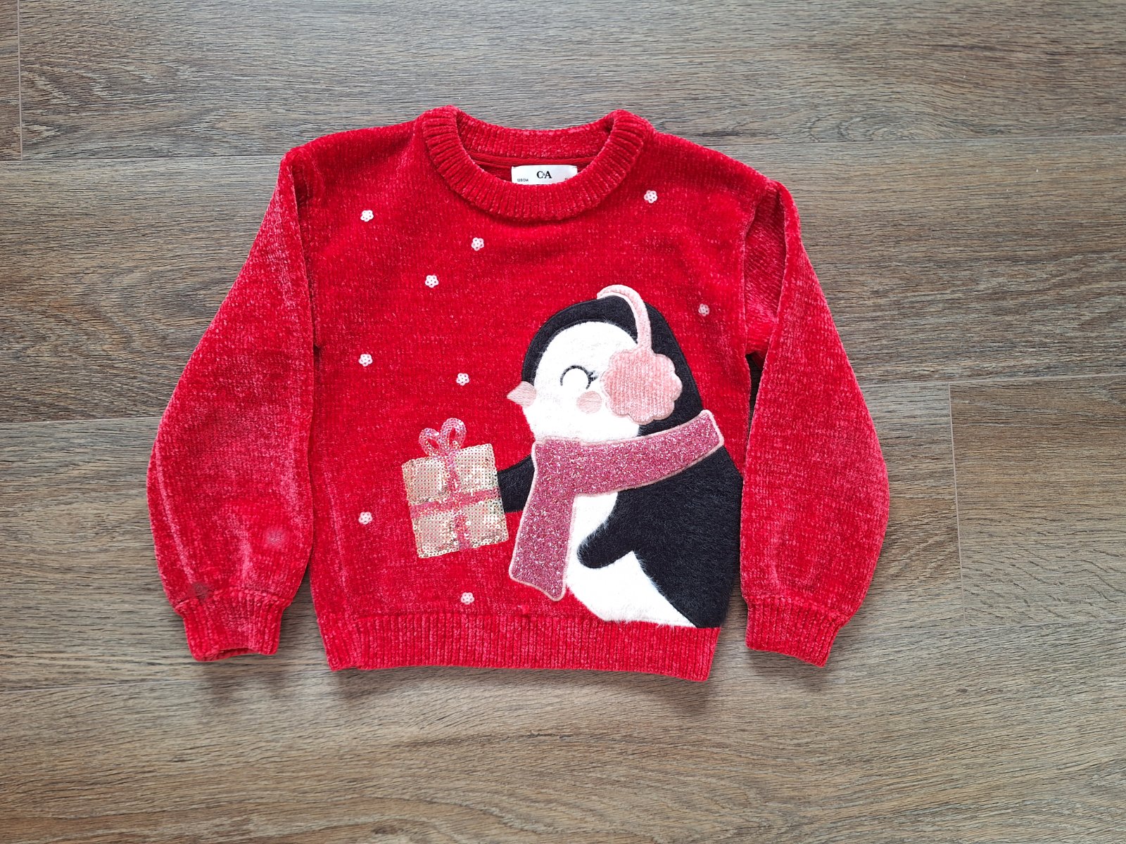 Červený svetr s tučňákem