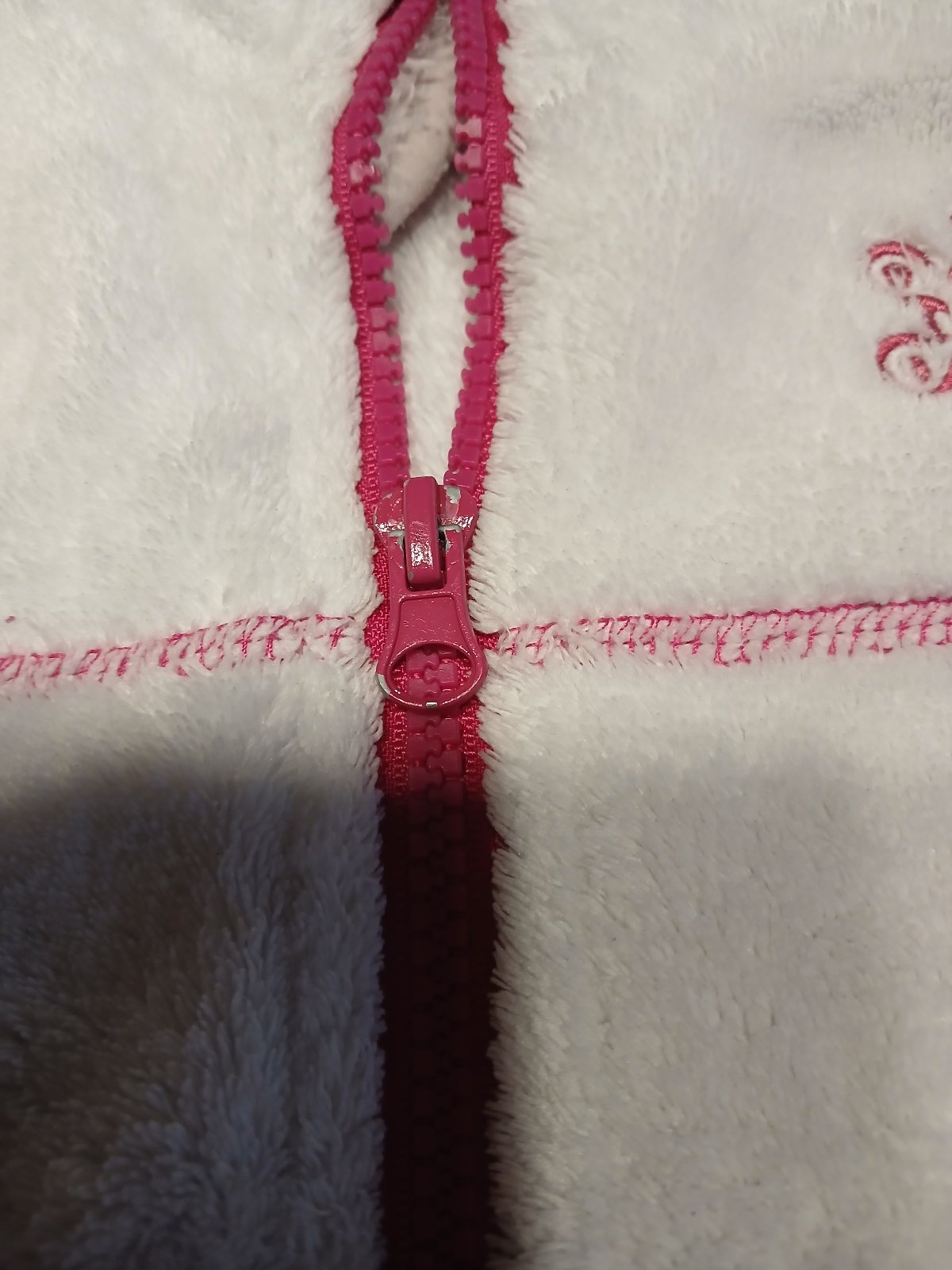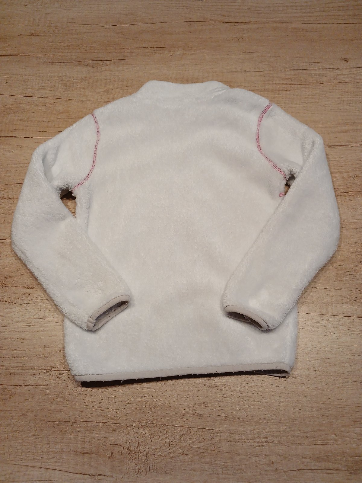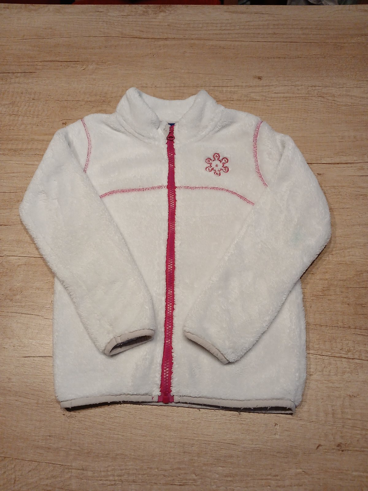 Syte ruzova flisova mikina se stojackem, velmi prakticka a hrejiva, vel.110/116.velmi pekny stav bez vad,jen par zmoliku na lemu a trochu odreny tahacek zipu, zohledneno v cene.