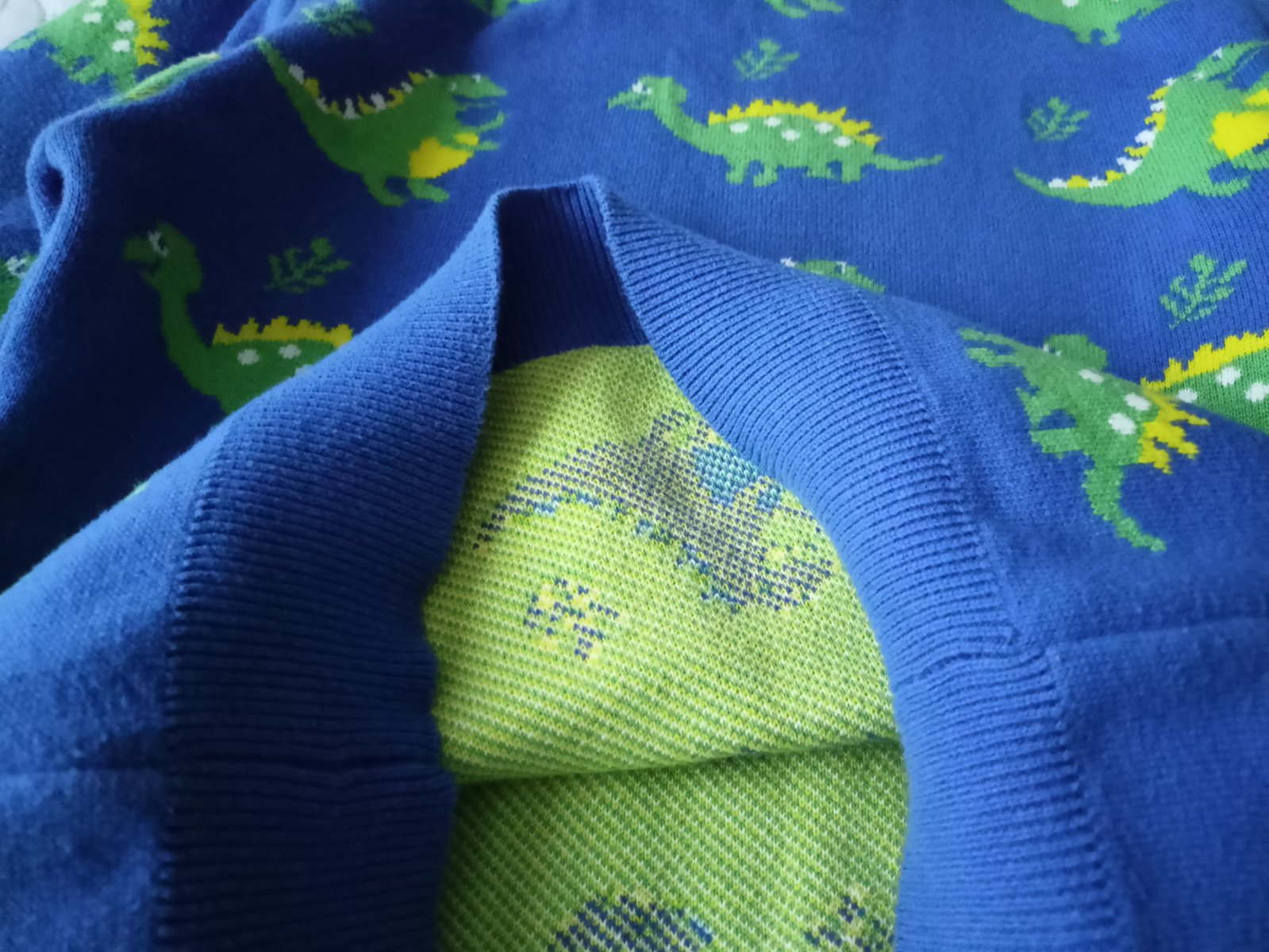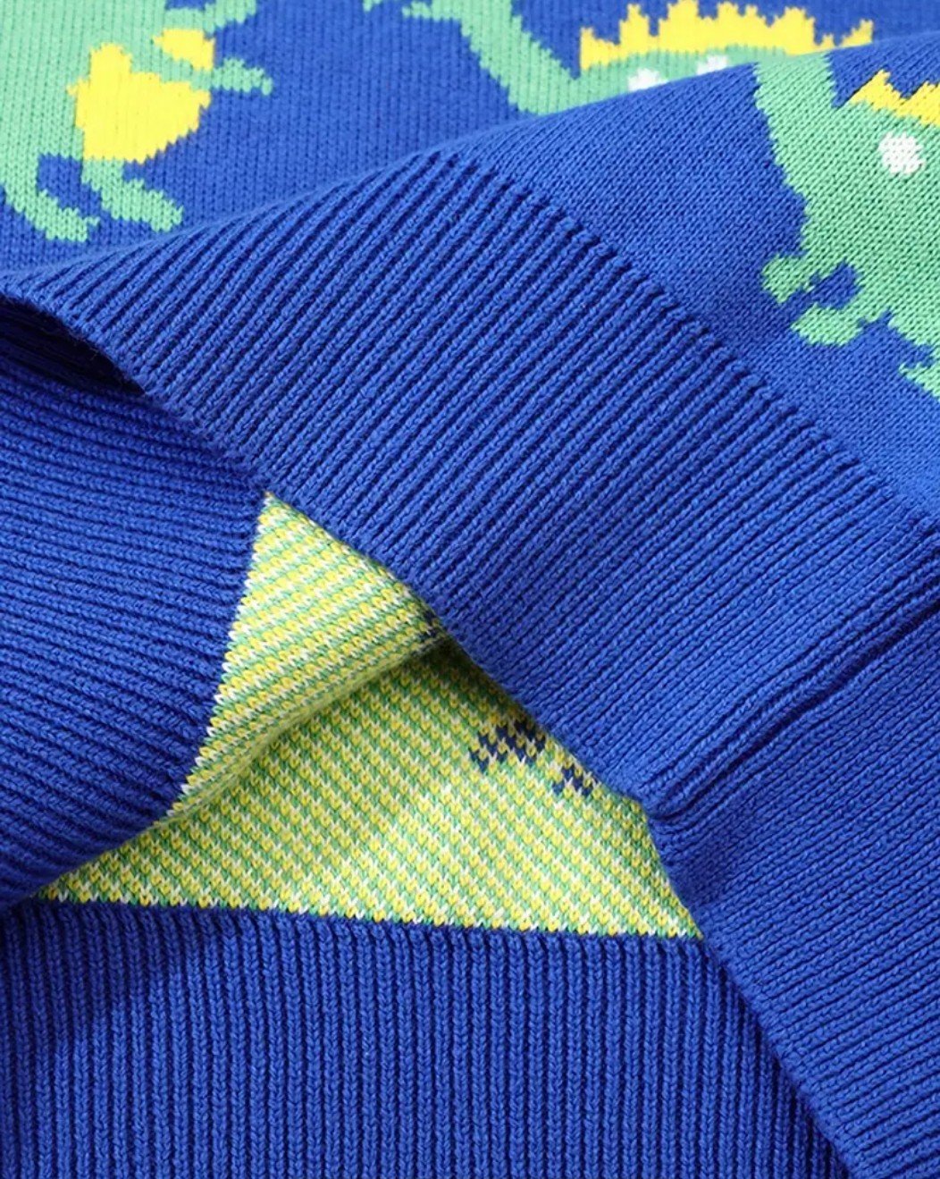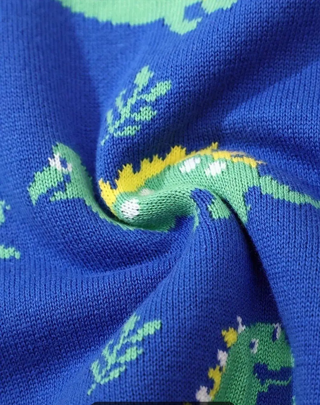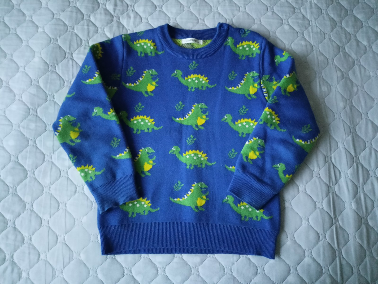 .Roztomilý pletený svetr z řady DINO, který se obléká přes hlavu, zajišťuje pohodlí a rychlé oblékání. Svetr v modré barvě a motivem dinosaurů, což mu dodává veselý charakter. Knoflíky u ramene dodává eleganci. Skvělý na chladnější dny, přidává kouzlo a styl každému mladému chlapci!