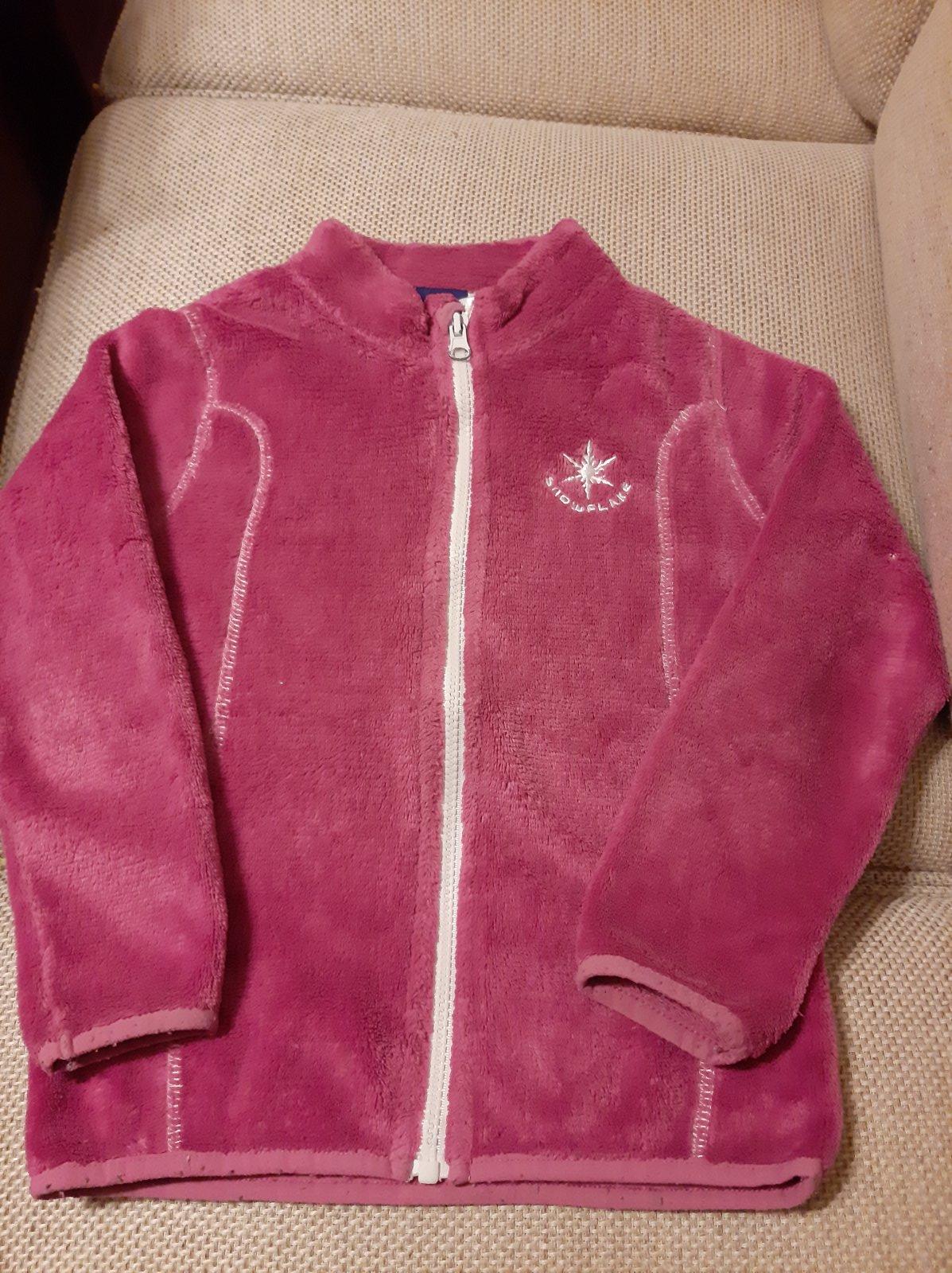 Syte ruzova flisova mikina se stojackem, velmi prakticka a hrejiva, vel.110/116.velmi pekny stav bez vad,jen par zmoliku na lemu a trochu odreny tahacek zipu, zohledneno v cene.