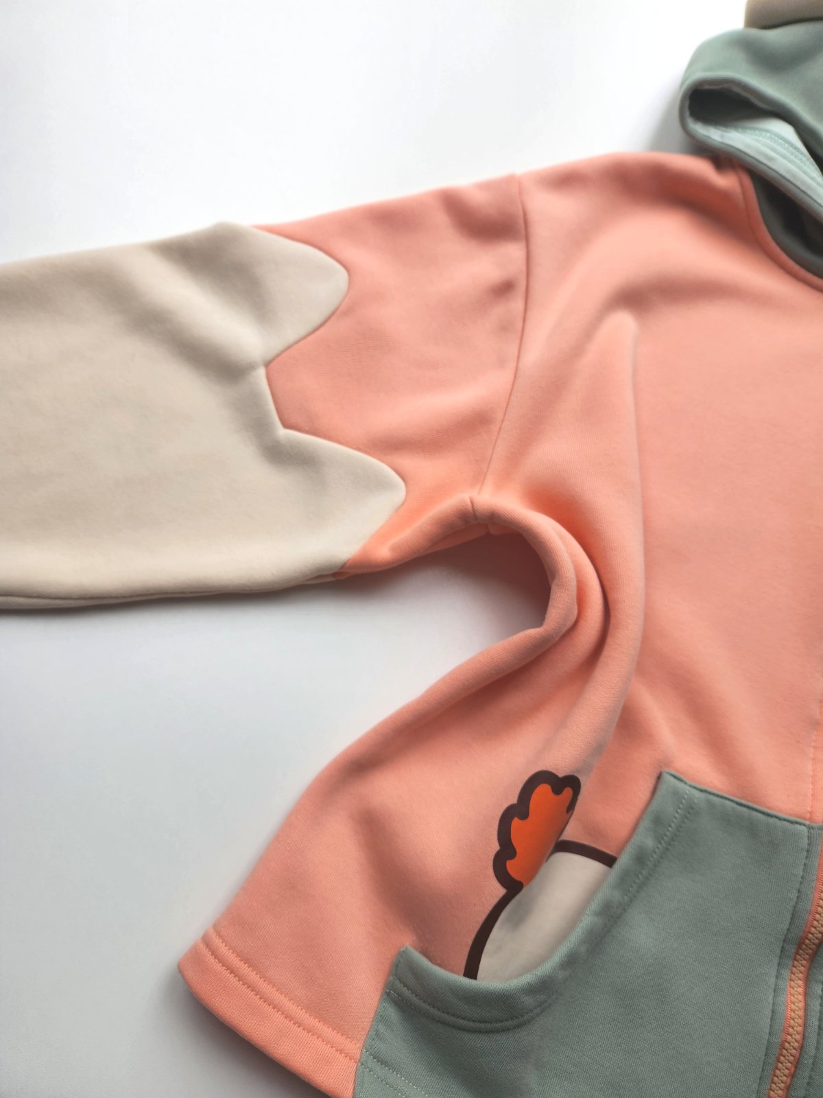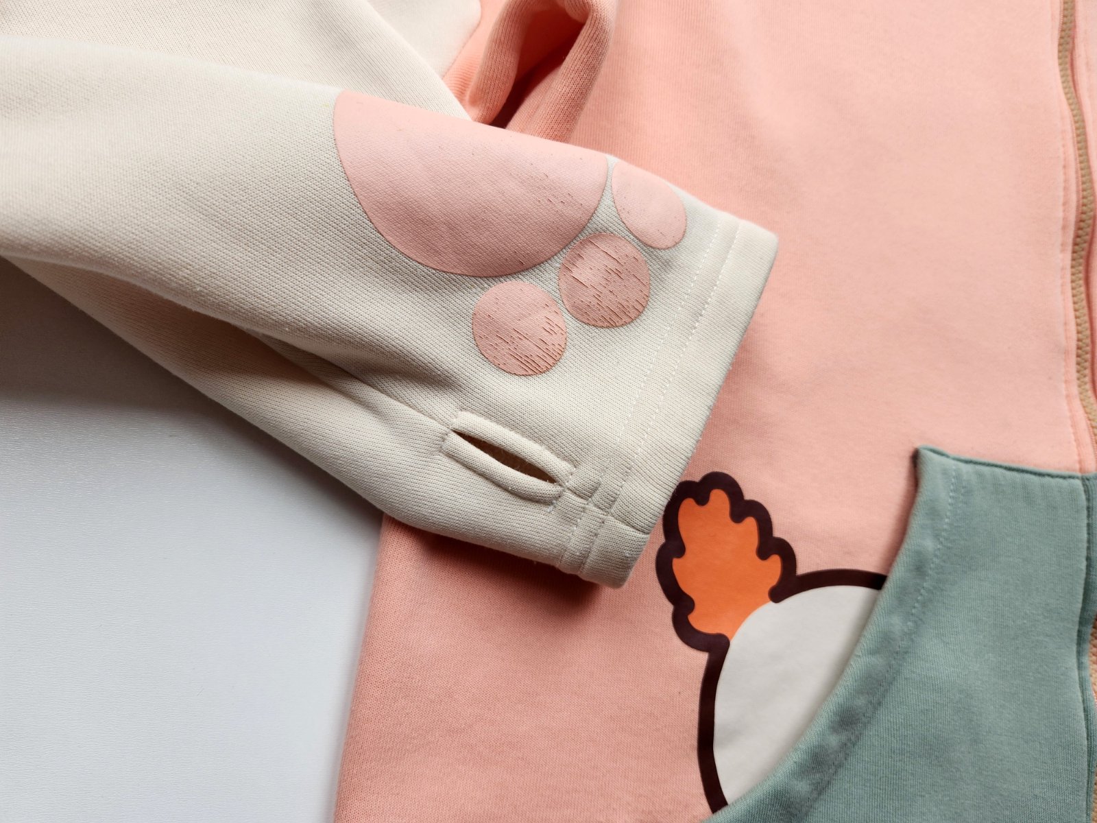 Obrázková volná lososová mikina s krémovými a šedými díly, kapuce s podšívkou a vycpanými oušky, zip, kapsy, rukávy s otvory na palce a potiskem tlapek, obrázkový potisk.