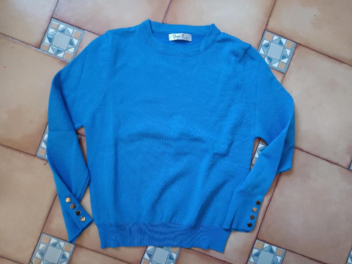 tm. modrý, chlupatý svetr. Top stav, málo nošené, bez vad. Složení mat. dle visačky viz. foto detail. CELK. DÉLKA: 40cm PŘES PRSA: 2x 38cm D. RUKÁVU OD KRKU: 53cm