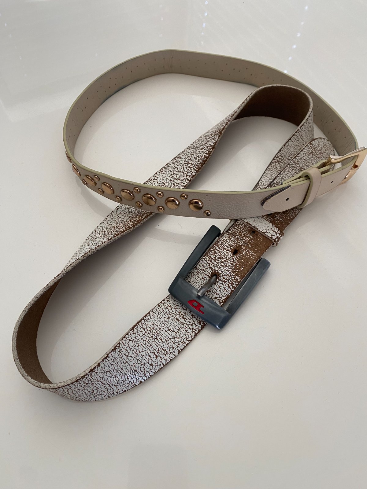Bílý - motiv šoupaného vzhledu, pravá kůže, délka 94 cm, šířka 3,5 cm; vhodný pro obvod 73 - 86 cm; 150 Kč.