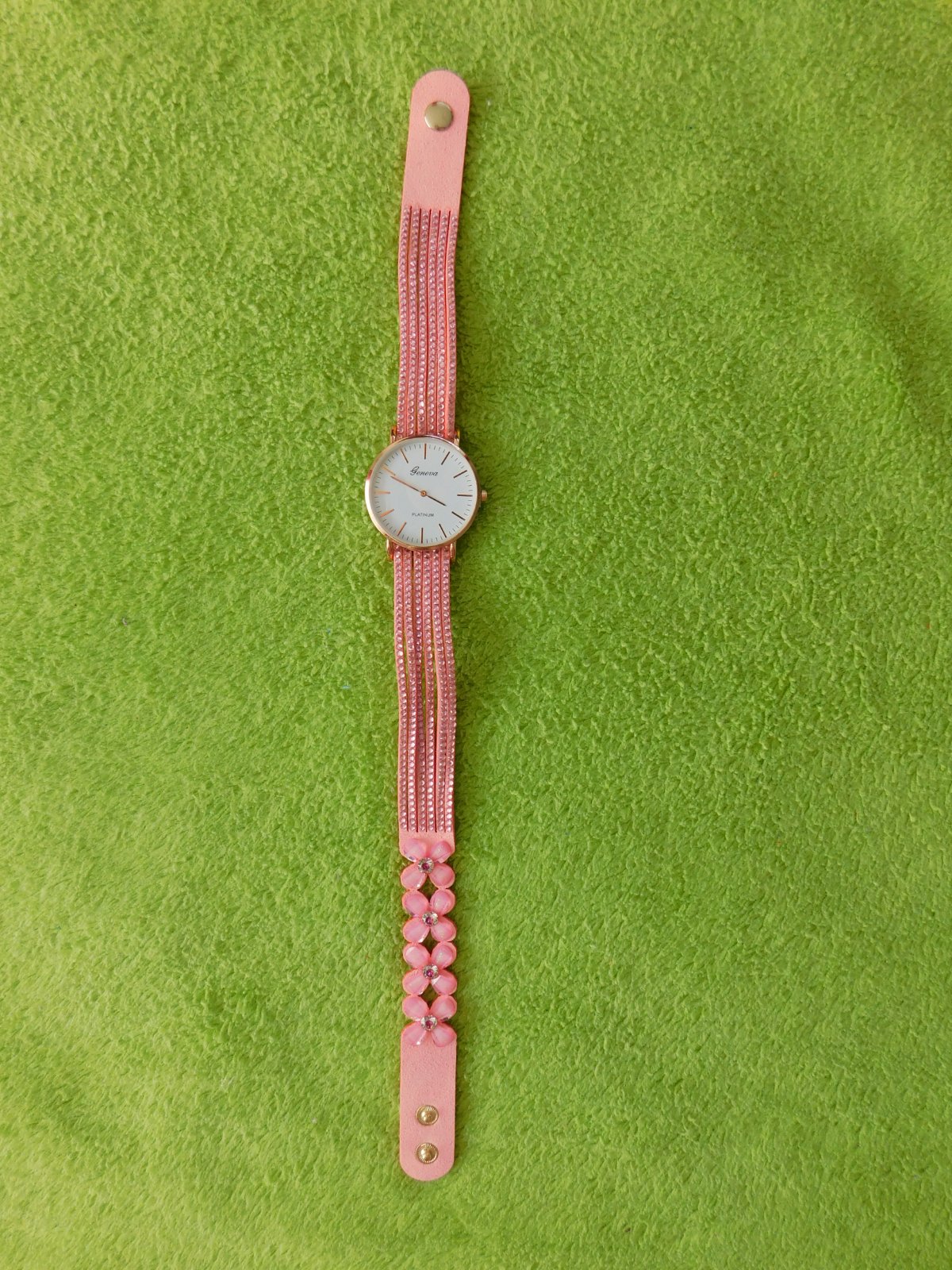 Hodinky pro slečnu nebo paní (dívčí / dámské), růžové, kožený pásek, zdobené kamínky, strojek Quartz, zcela funkční, nutné vyměnit baterku, moc hezké a slušivé, celková délka 23 cm, cena 130 Kč