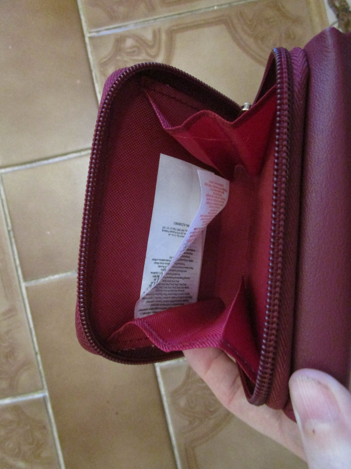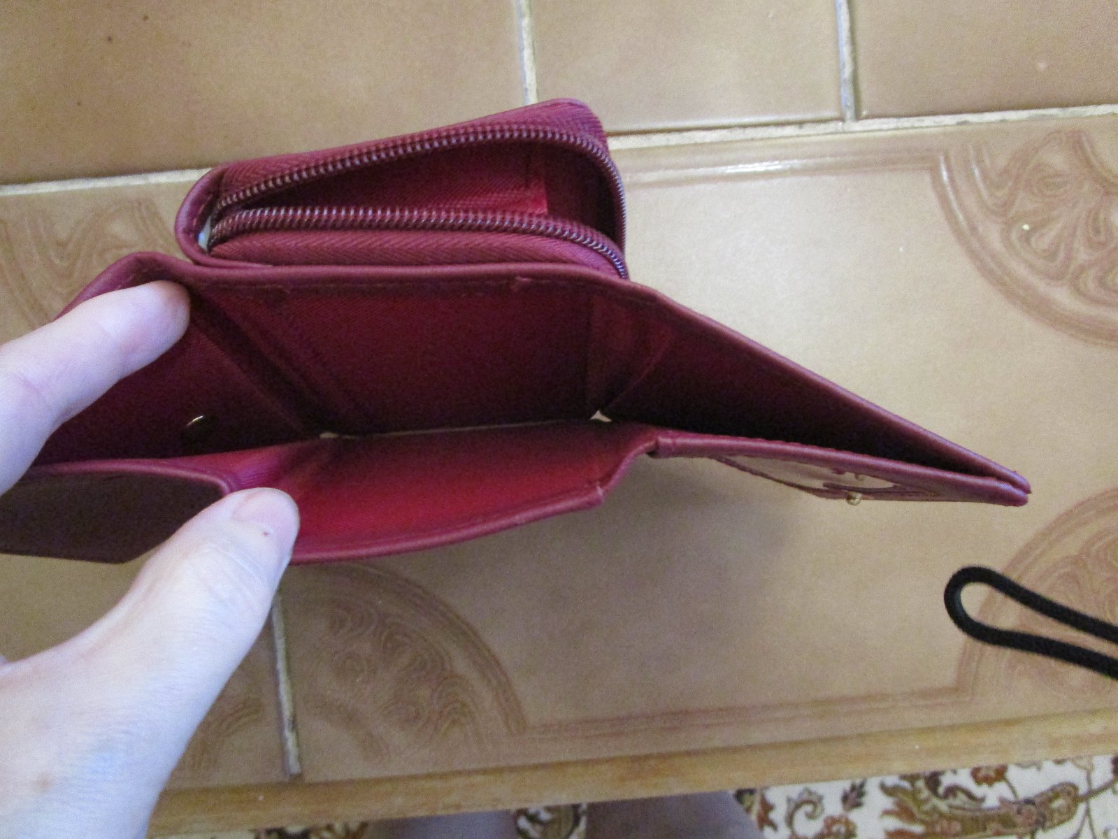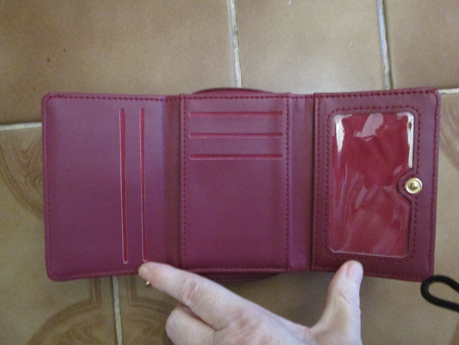 Jako nová vínová šikovná peněženka, rozměry složená 11x9x4 cm, rozložená 23 cm, cena jen 89 Kč.