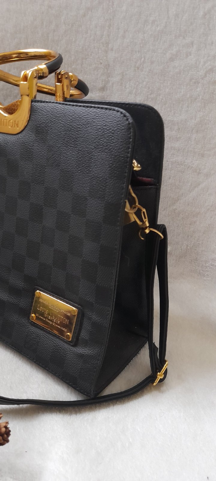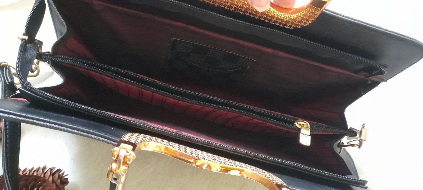 ✒ popis: odepínací nastavitelný popruh přes rameno, hlavní komora zapínání na zip, vnitřní kapsa na zip, malá kapsička na karty, zlaté doplňky a kovová držadla