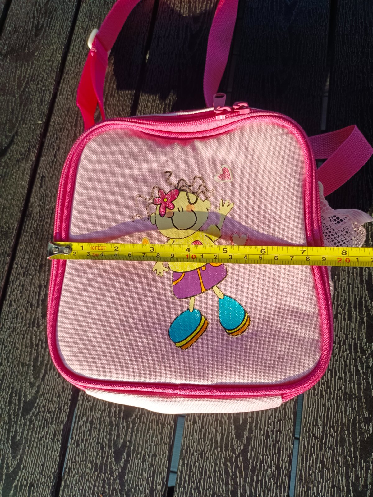růžová s holčičkou - taška, lze i částečně termotaška, trochou vybledlý obrázek, povolená gumička na boční kapse viz. foto,