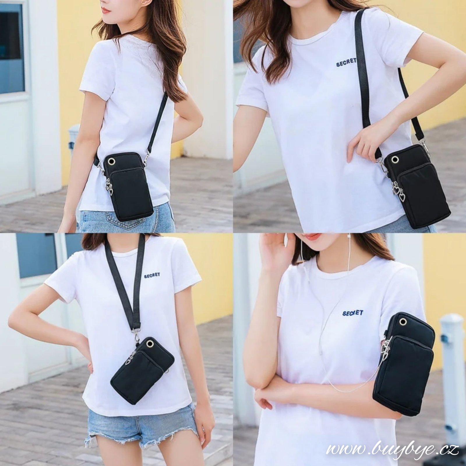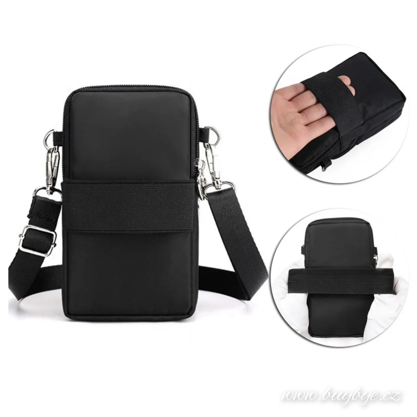 Originální, multifunkční mini taška, kterou lze nosit na mnoho způsobů přes rameno nebo díky gumě třeba na paži či předloktí.