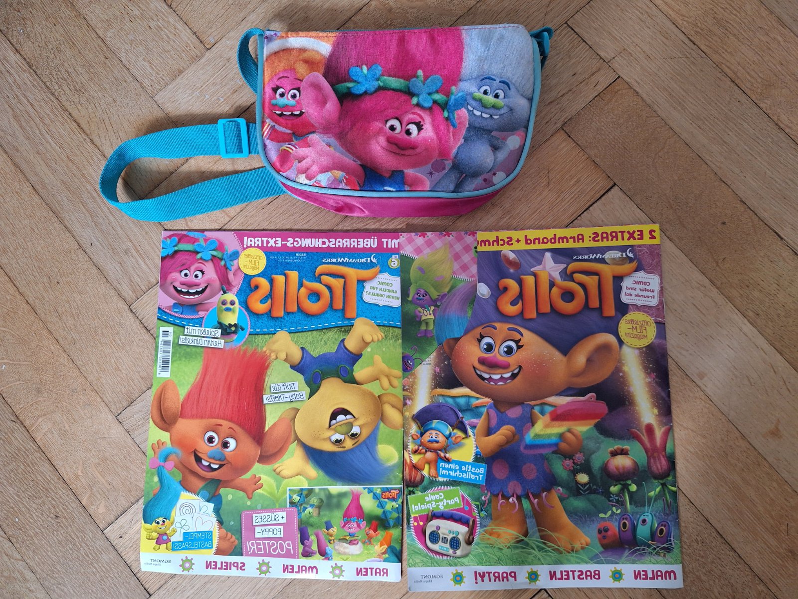2 časopisy a kabelka motiv Trolové.