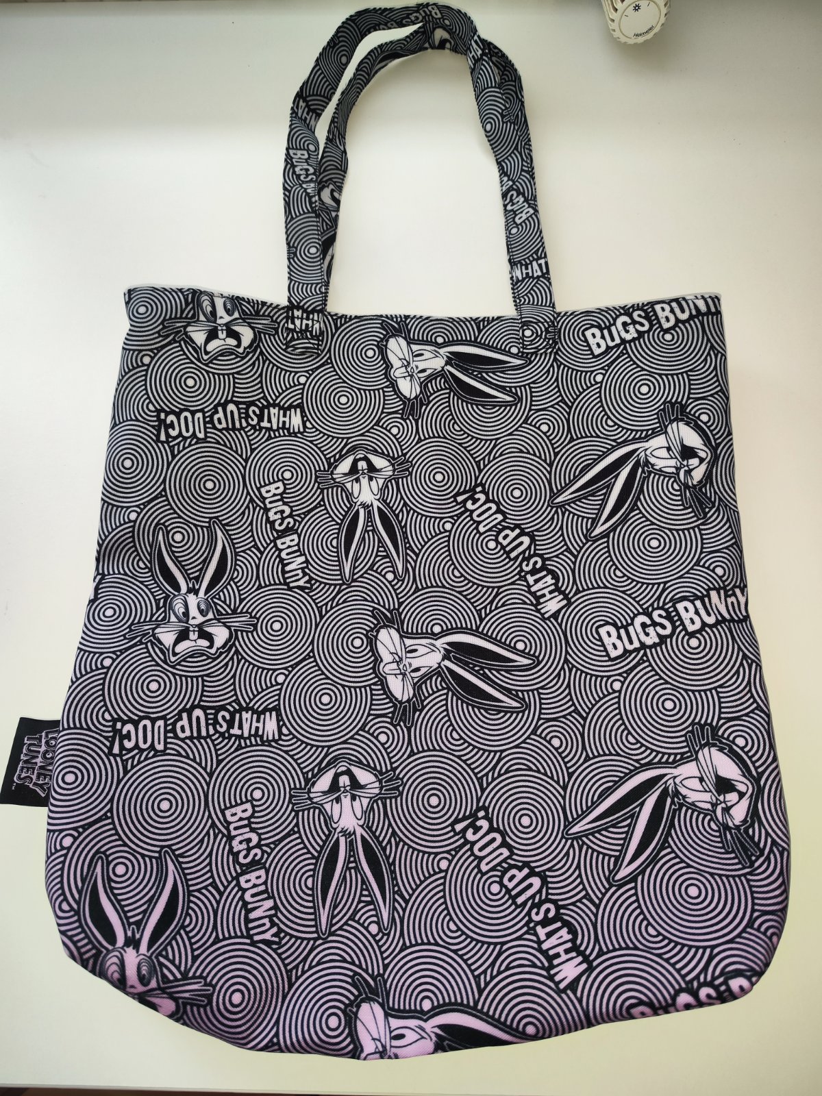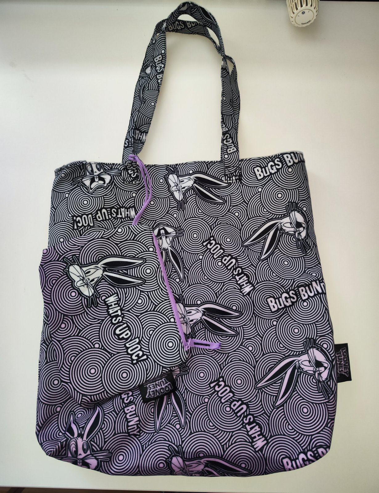 Prodám tašku CCC, Looney tunes s motivem Bugs Bunny. Rozměry – cca 45 cm x 41 cm. Materiál polyester. Dlouhá ucha, zapínání na zip. K tomu je menší taštička se zapínáním na zip a fialovou šňůrkou (dá se přichytit na větší tašku – foto), rozměry 22 cm x 17 cm. Tašky jsou vyprané. Cena za obě 130 Kč, v Brně možné osobní předání.