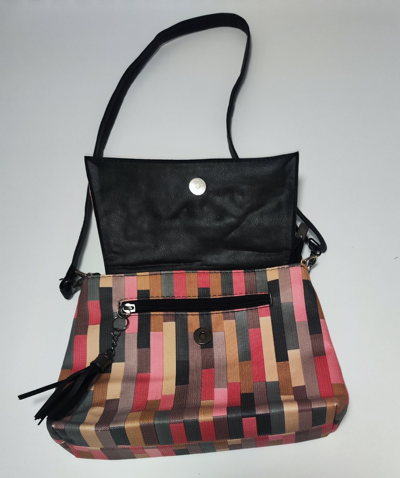 Prodám stylovou kabelku Liebeskind Berlin, koupena ve Španělsku. Originální kousek s barevným geometrickým vzorem. Po otevření je tam malá kapsa na zip s ozdobnými třásněmi. Kovové logo na přední straně, gravírovaný zip Liebeskind, podšívka s potiskem značky – černá v hlavním prostoru, šedá v menší kapse.. Šířka dna 23, 5 cm; výška 19 cm. Ramenní popruh je nastavitelný a odepínací, takže ho lze snadno vyměnit. Minimálně nošená, cena 700 Kč, v Brně možné osobní předání.