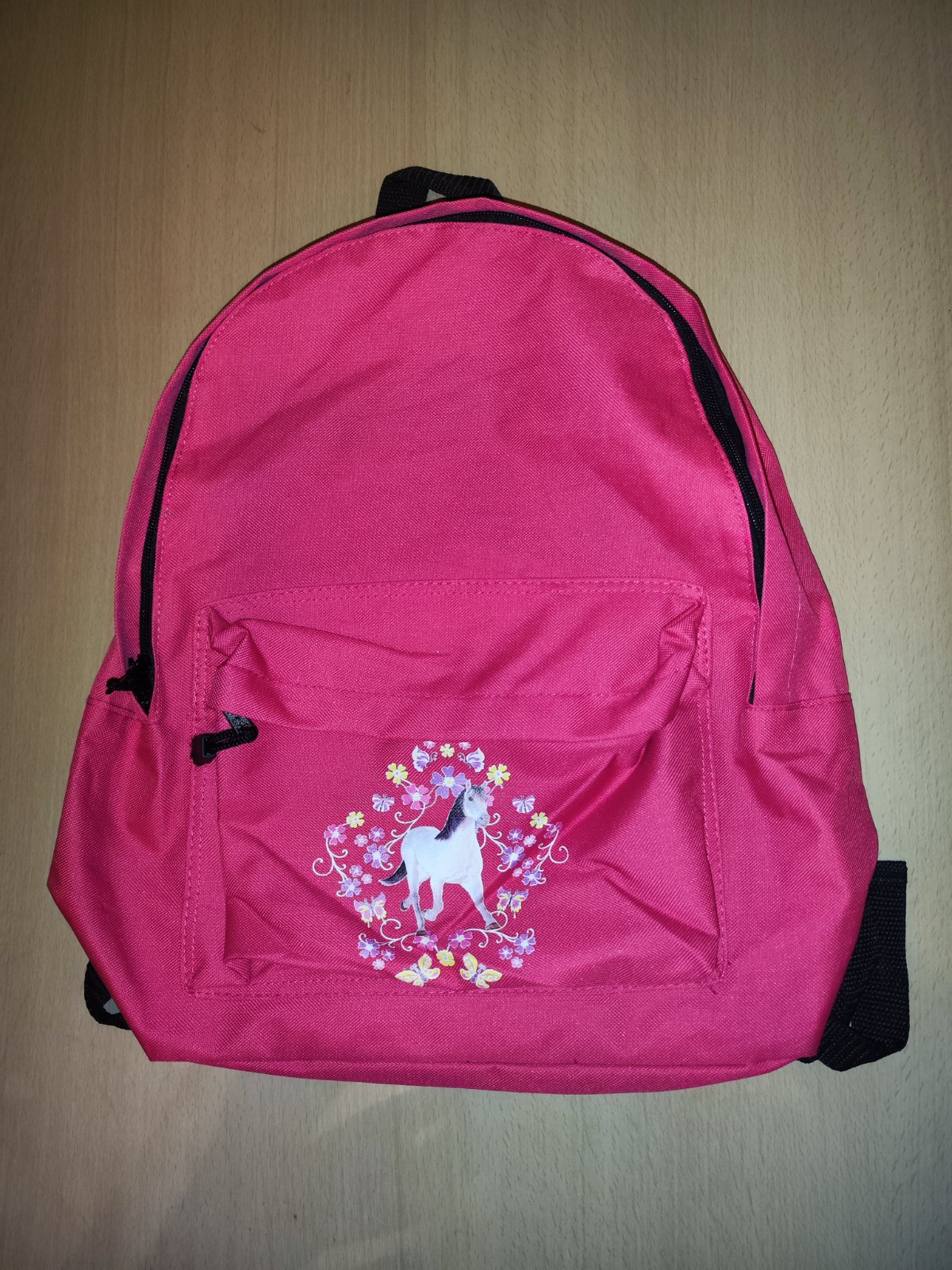 Prodám růžový batoh, nejvyšší délka 40 cm; šířka dolní strany 29, 5 cm. Vepředu je kapsička se zapínáním na zip. Batoh má nastavitelné popruhy, na batohu poutko. Cena 50 Kč, v Brně možné osobní předání.
