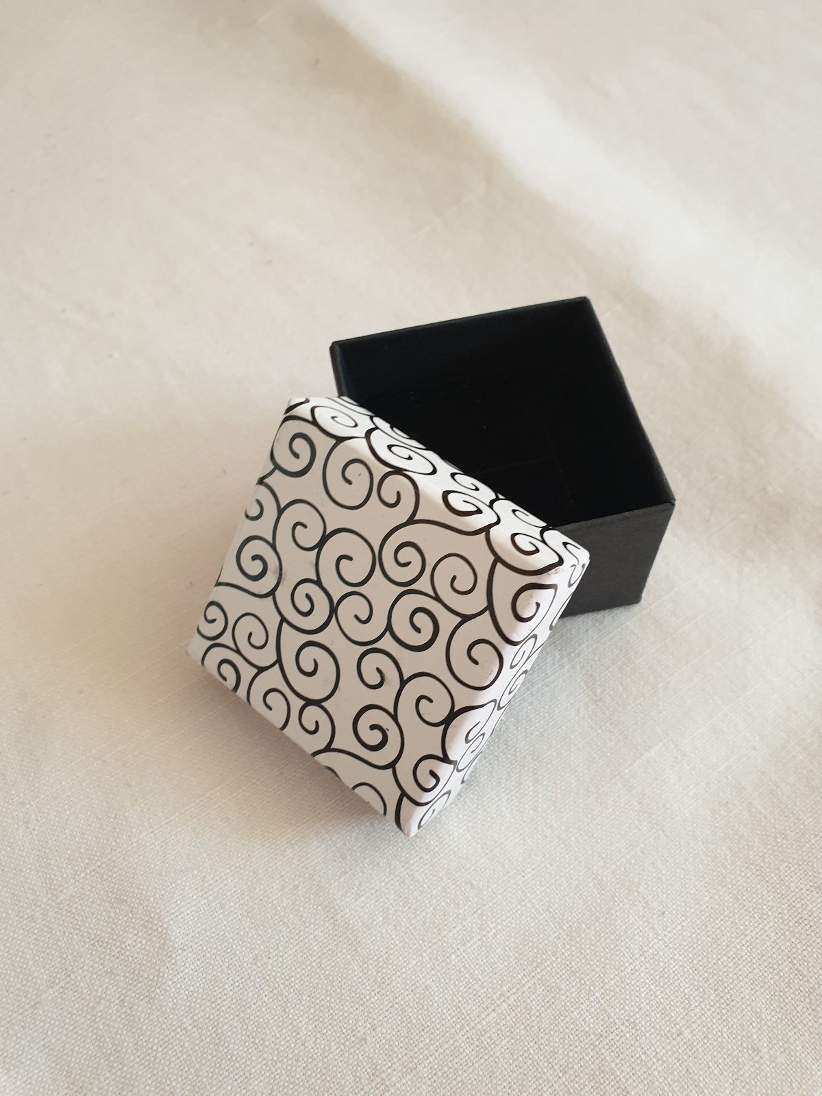Papírová dárková krabička s motivem a černou poduškou uvnitř. Rozměry: 45x45x35 mm. Vhodná pro prsten nebo náušnice.
