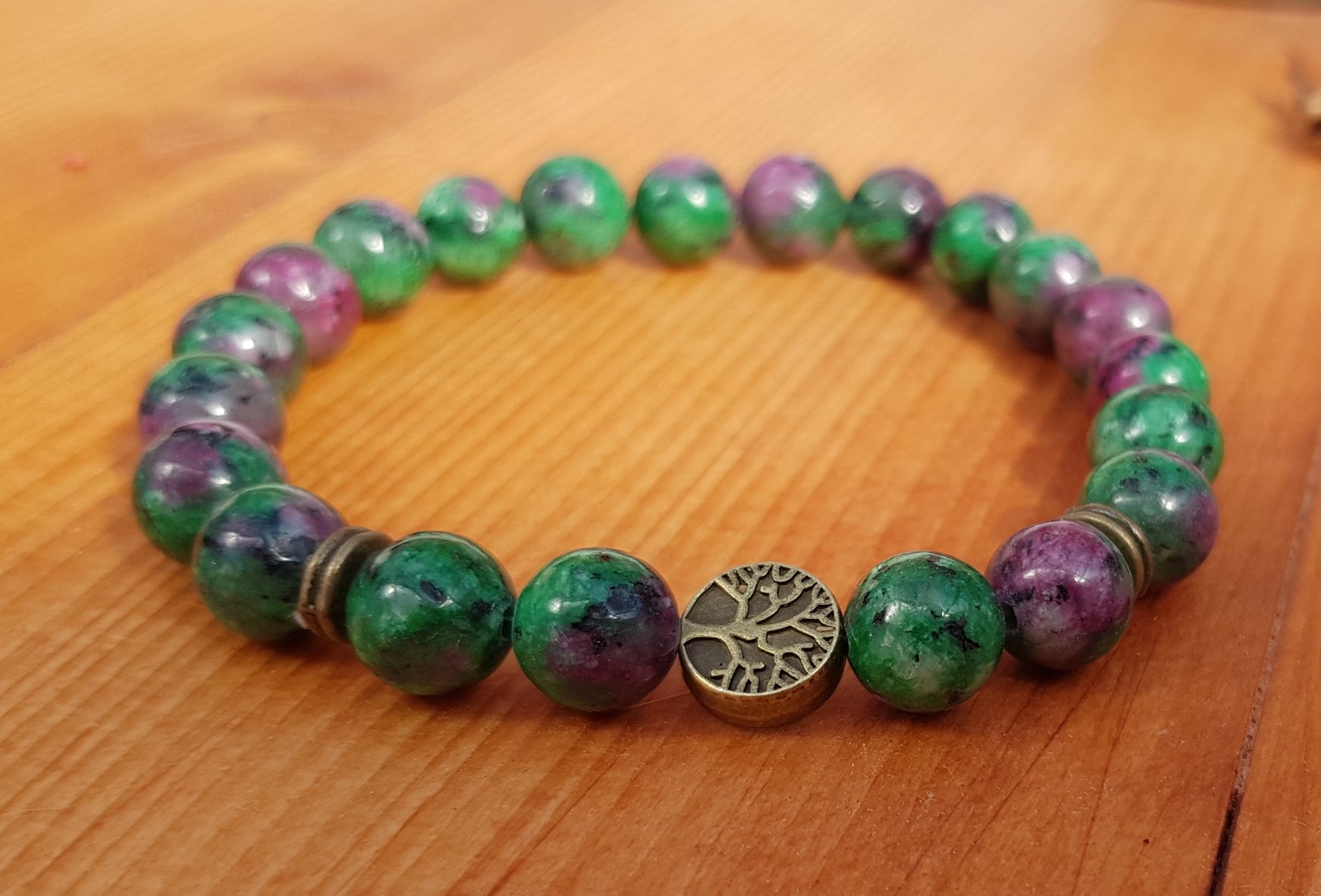 Krásný náramek tvořen z korálků Jaspisu v zeleno fialové barvě pro pohodu a klid duše, s přívěškem stromu.