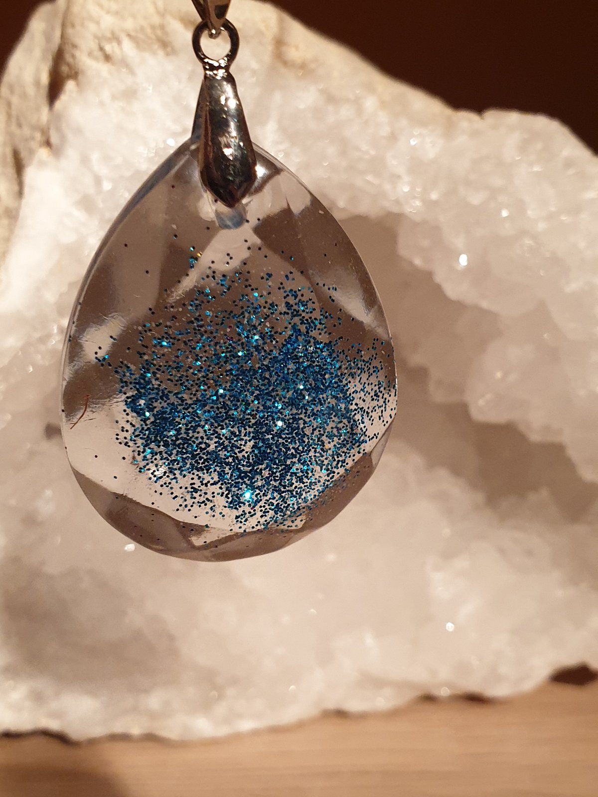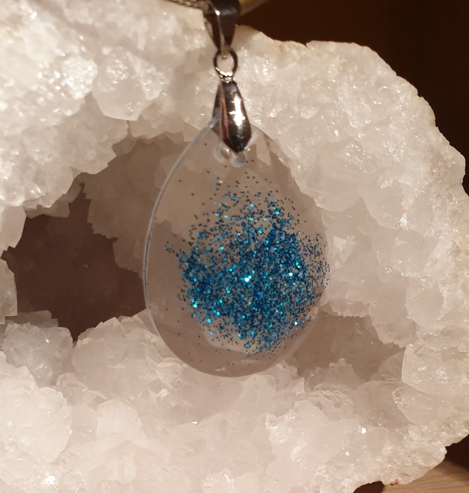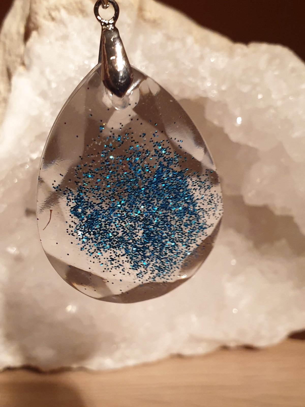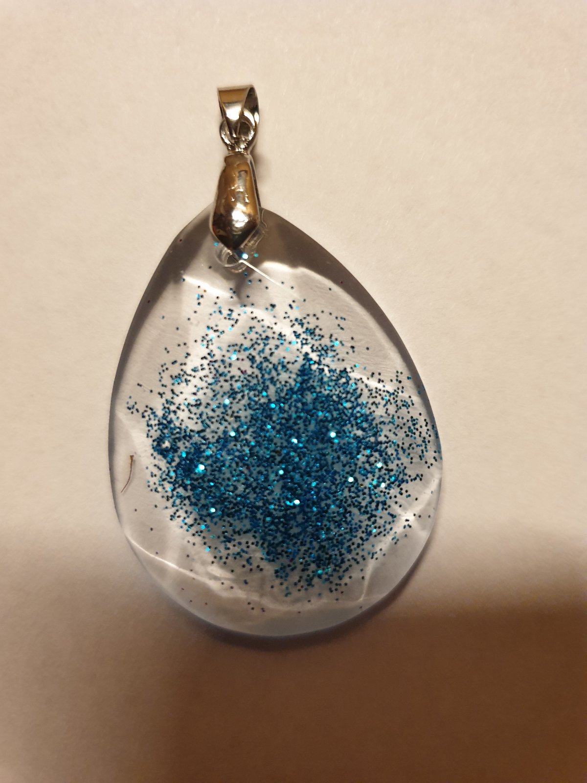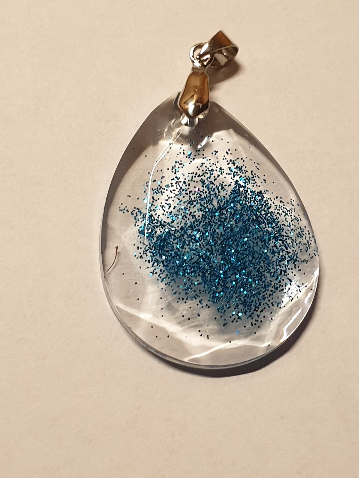 přívěsek kapka s bižuterním úchytem. průhledný a efektní design se třpytkami. velikost: šířka 3 cm, výška s úchytem 5 cm. ruční práce. každý kus je originál. kupujete vyobrazený kus.